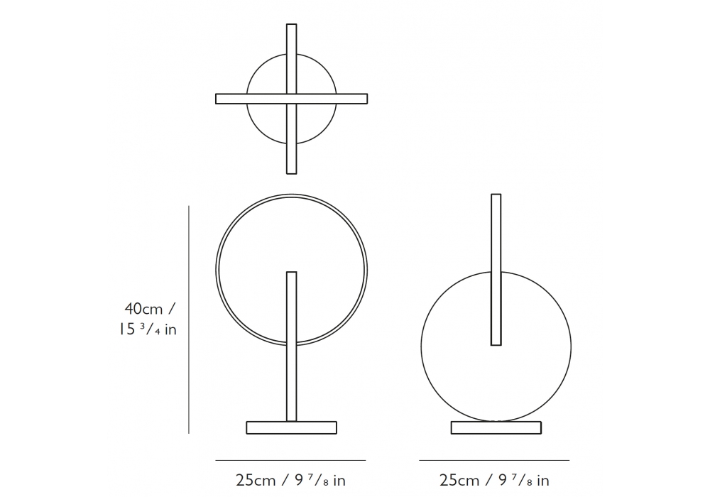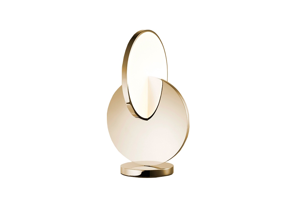 Eclipse Gold producida y diseñada por Lee Broom es una lámpara de mesa compuesta por dos discos opuestos en oro pulido espejo y difusor acrílico opal. La fuente de luz es de tipo LED regulable.