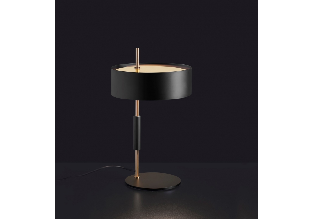 1953 diseñada por Ostuni & Forti para Oluce es una lámpara de mesa realizada íntegramente en metal con base circular pintada en negro mate y varilla vertical en color oro satinado. La pantalla es de metal negro mate con tapa dorada satinada y protege una fuente de luz.