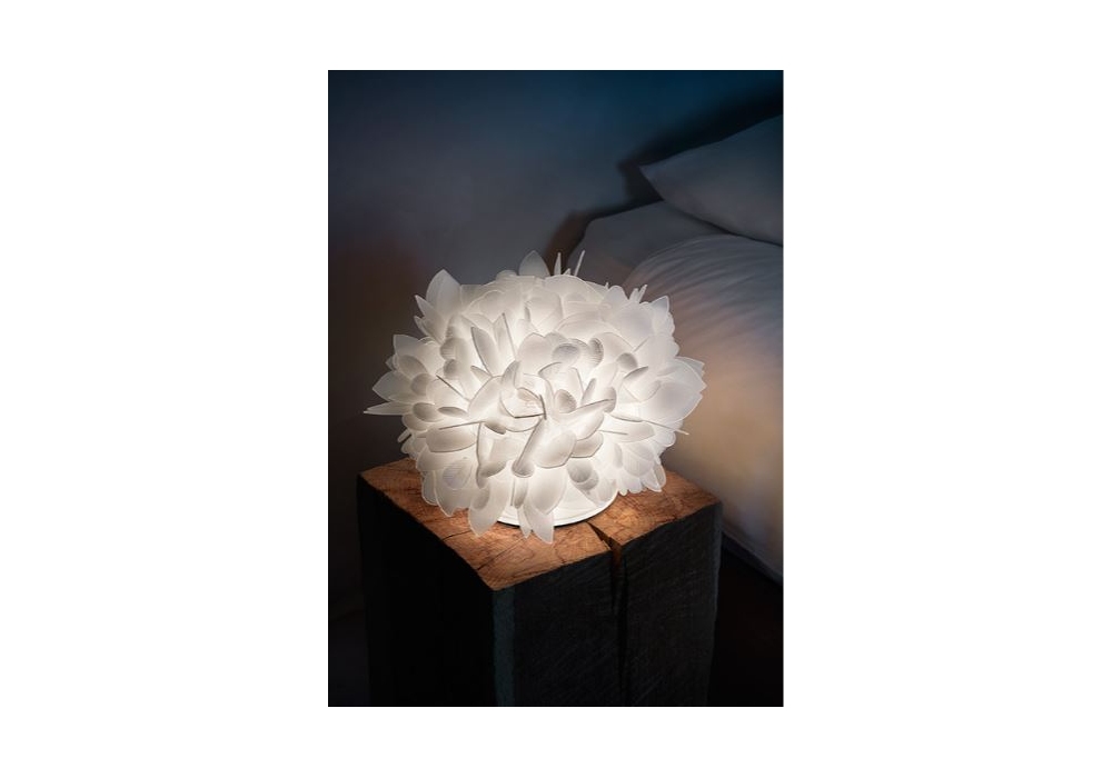 Veli Foliage diseñada por Adriano Rachele para Slamp es una lámpara de mesa en Opalflex y base en metacrilato con sistema magnético ensamblado totalmente a mano. La fuente de luz adoptada es de tipo LED de filamento.