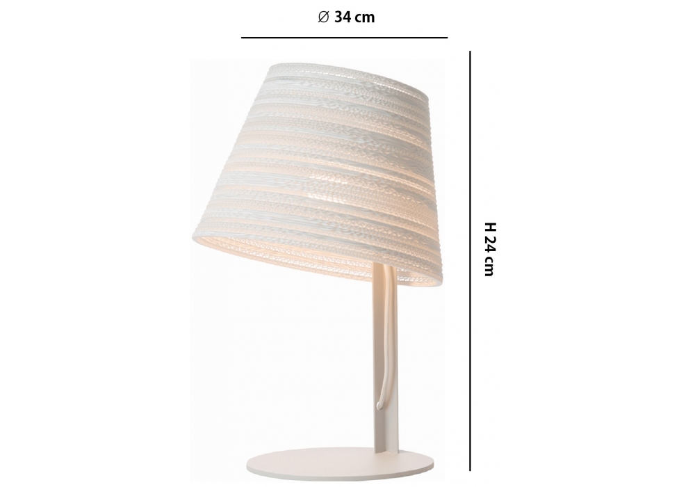 Tilt diseñada por Graypants es una lámpara de sobremesa con estructura en acero pintado en polvo (gris o negro) y difusor en cartón ondulado reciclado en dos variantes (blanco y natural). El cordón es de tela blanca o negra.