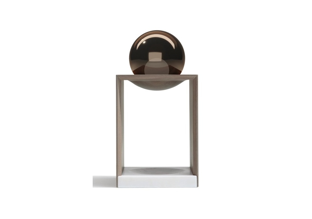 Spaziotempo diseñada para Carlo Colombo para Giorgetti es una lámpara de mesa con estructura de nogal canaletto, base de mármol Calacatta oro y difusor de cristal esférico.