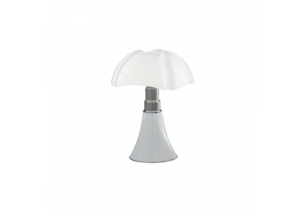 Minipipistrello diseñada por Gae Aulenti para Martinelli Luce es una lámpara de mesa con brazo central telescópico en acero inoxidable y base en metal pintado. El difusor es de metacrilato opal blanco y apantalla una fuente de luz LED integrada regulable. Minipipistrello está disponible en diferentes acabados.