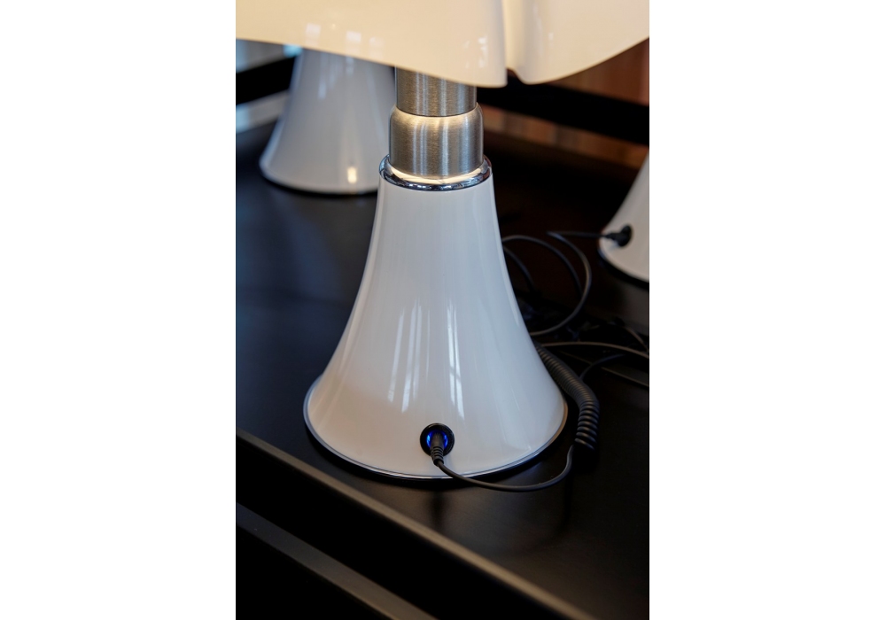 Minipipistrello Cordless diseñada por Gae Aulenti para Martinelli Luce es una lámpara de mesa portátil y recargable con sensor táctil. El brazo telescópico central es de acero inoxidable con soporte circular de metal pintado. El difusor es de metacrilato opal blanco y apantalla una fuente de luz LED integrada regulable. Minipipistrello Cordless está disponible en diferentes acabados.