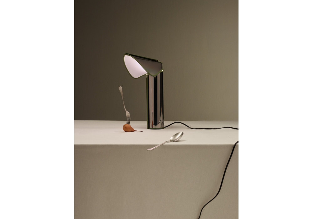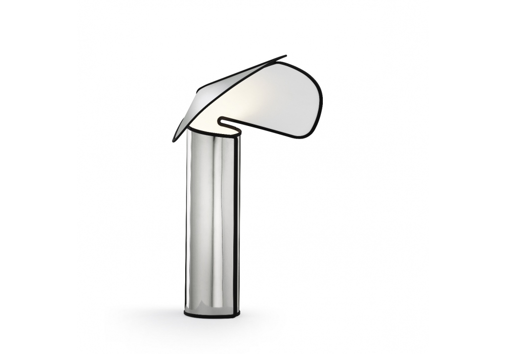 Chiara diseñada por Mario Bellini para Flos es una lámpara de mesa compuesta por un cuerpo reflector de aluminio, recubierto internamente con una película de plástico blanco mate, plegado y cerrado con ganchos de acero inoxidable remachados a la chapa metálica. Una junta de goma moldeada de color se aplica a todo el perfil del cuerpo. La base interna de aluminio extruido proporciona estabilidad al cuerpo que se fija a ella y soporta el portalámparas. Un regulador de intensidad luminosa está montado en el cable de alimentación. Bombilla no incluida.