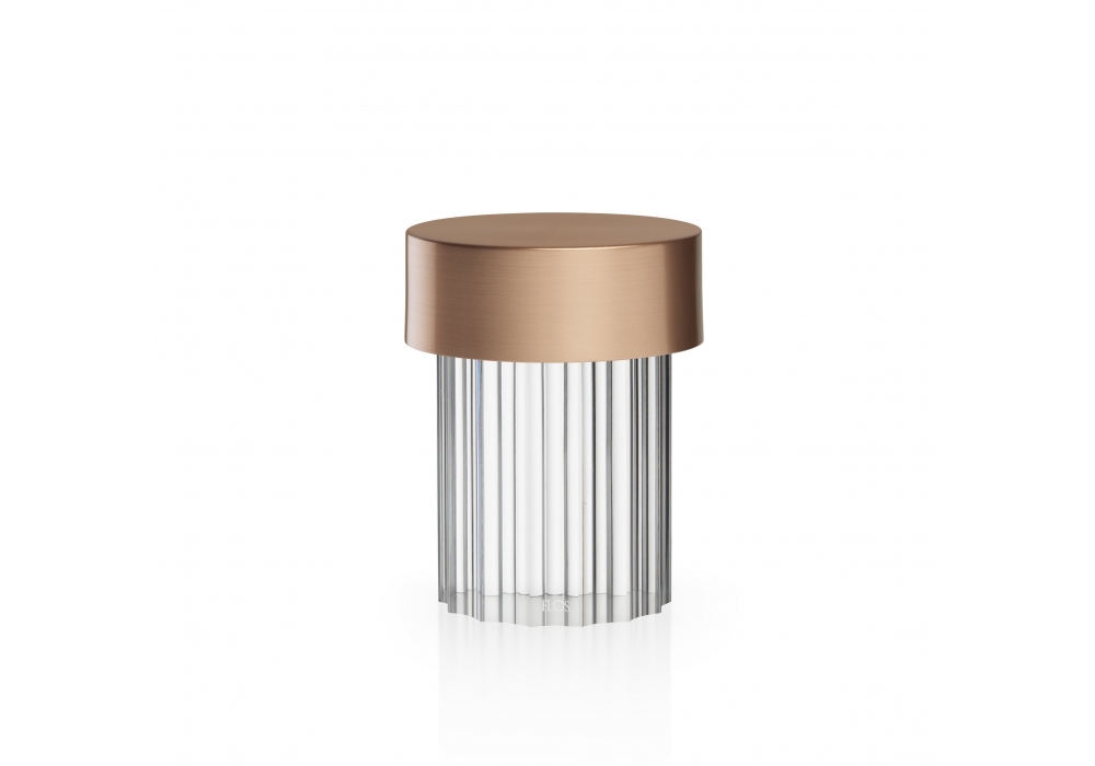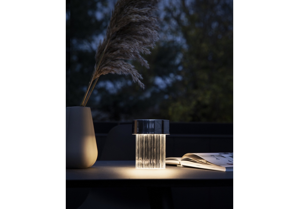 Last Order Fluted diseñada por Michael Anastassiades para Flos es una lámpara de mesa portátil y recargable, con una estructura que combina metal y vidrio. La base/difusor es de cristal macizo rayado e incorpora una fuente de luz LED, regulable mediante regulador de intensidad.