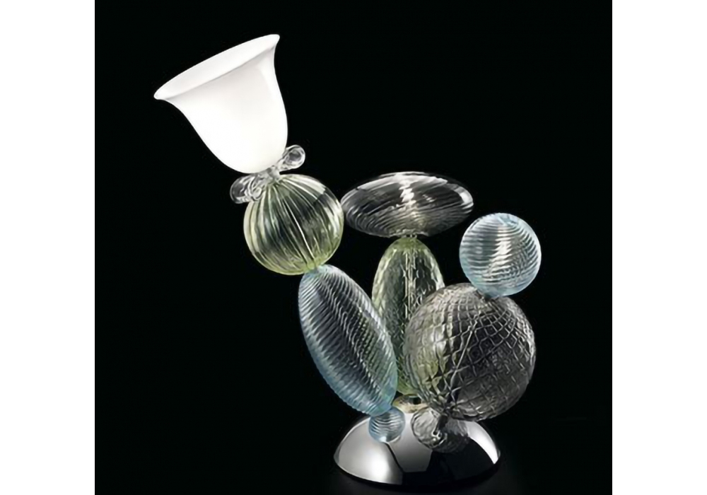 Perseus diseñada por Marcel Wanders para Barovier & Toso es una lámpara de mesa con base circular y decoraciones en metal de color cromo pulido. El cuerpo de la lámpara está estructurado por varios elementos geométricos en cristal veneciano. El difusor es una copa acampanada en vidrio opal y protege las fuentes de luz LED. Perseus está disponible en diferentes acabados.