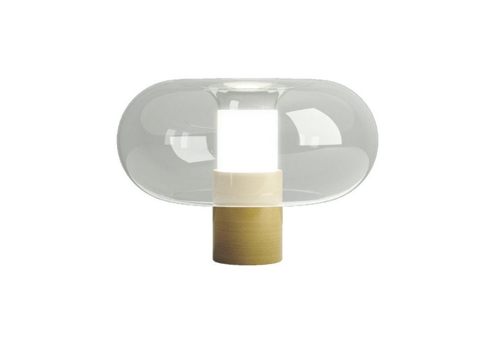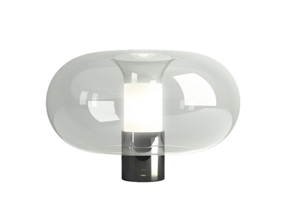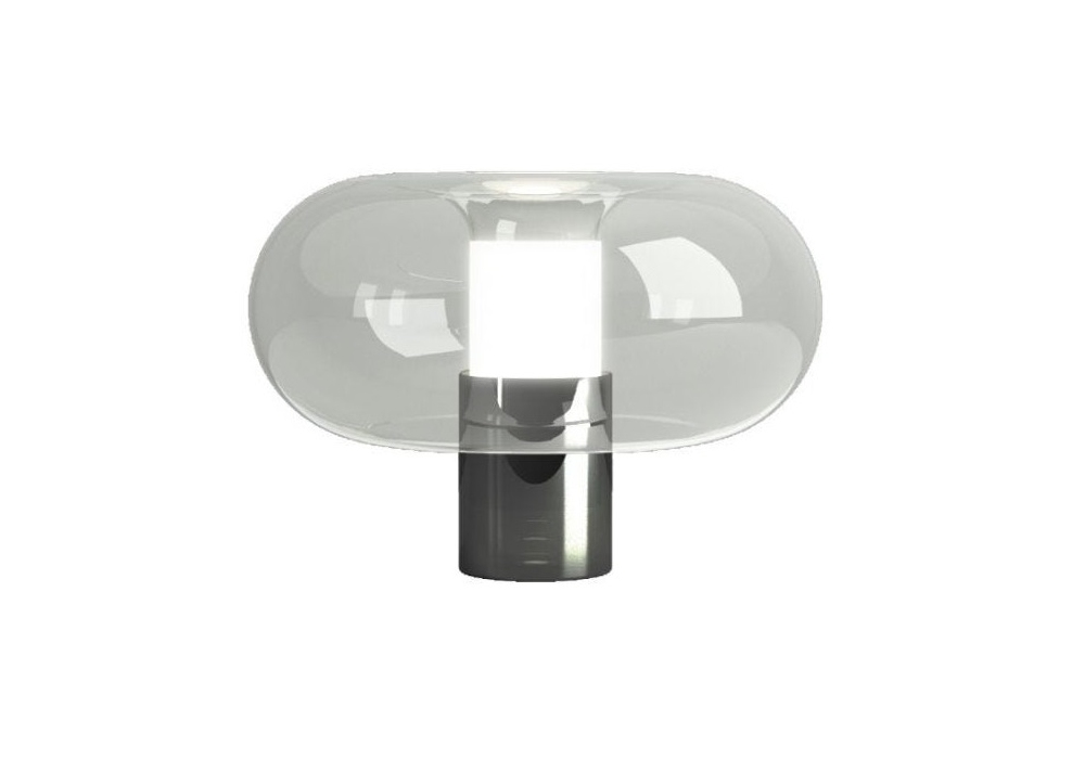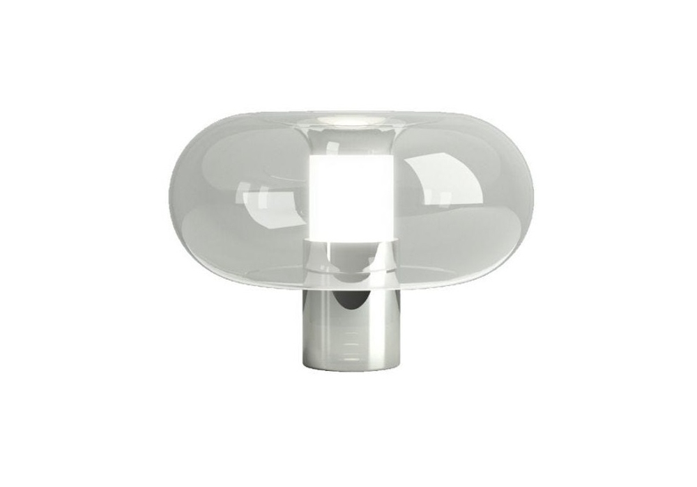 Fontanella diseñada por Federico Peri para Fontana Arte es una lámpara de mesa con estructura portante y base cilíndrica en metal galvanizado en los acabados: cromo, negro o latón. El difusor es elipsoidal en vidrio soplado transparente. Disponible en diferentes dimensiones.