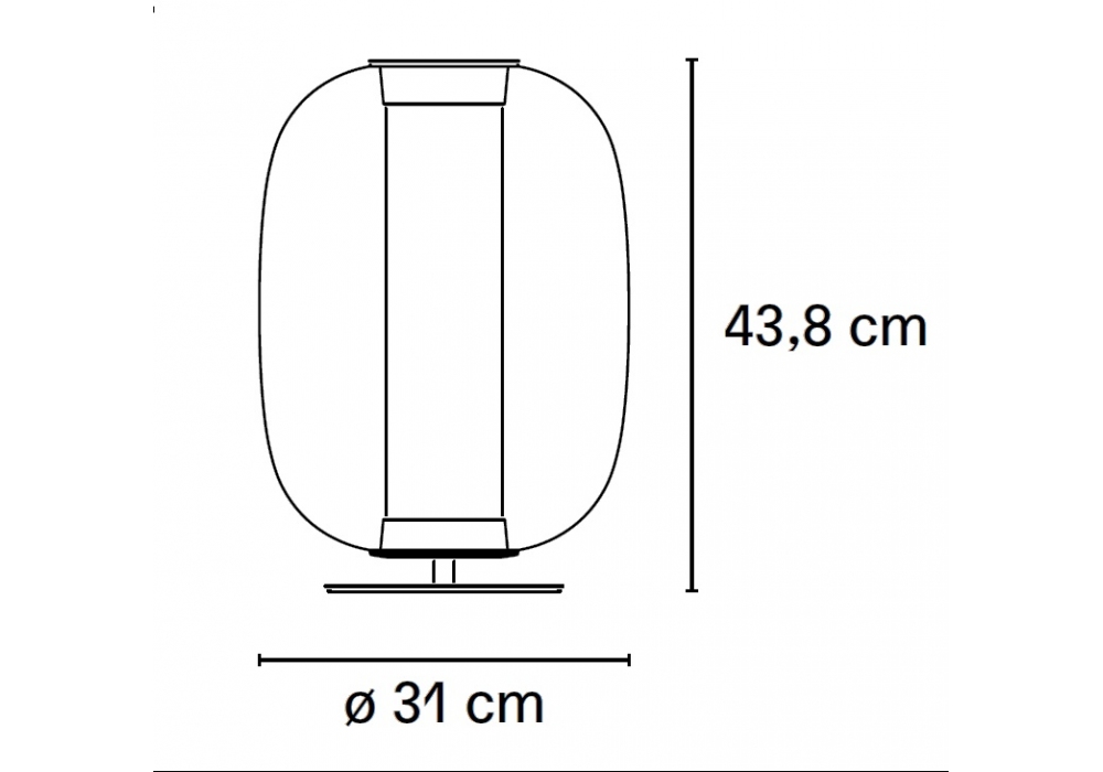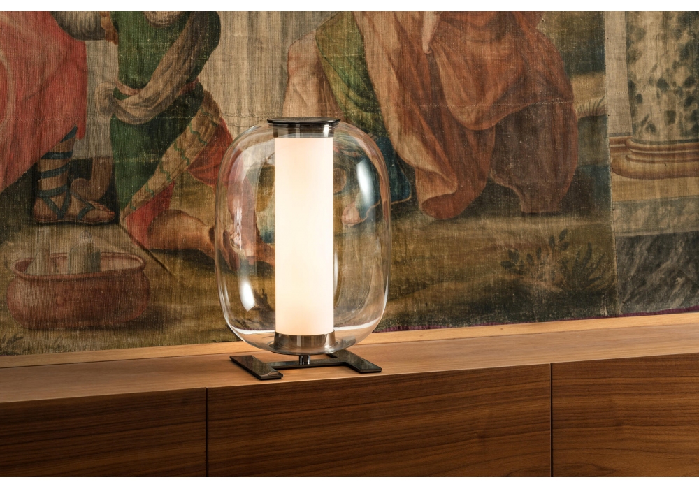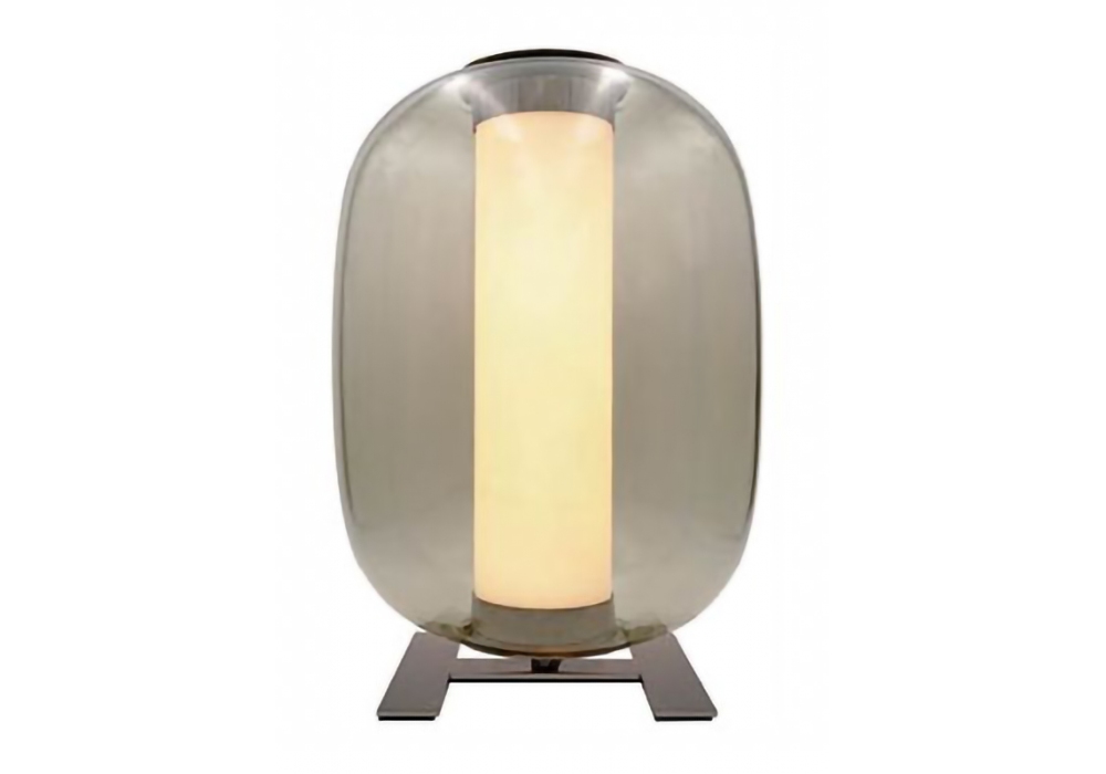 Meridiano diseñada por Gabriele y Oscar Buratti para Fontana Arte es una lámpara de mesa, con estructura portante en metal niquelado y base circular. El difusor es elipsoidal en vidrio soplado mientras que el interno es en vidrio pyrex pintado en tres acabados diferentes: ahumado, rosa o transparente. La fuente de luz utilizada es de tipo LED regulable (incluida).