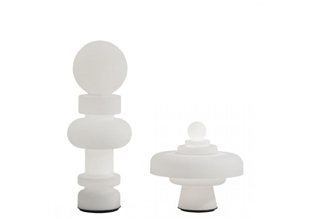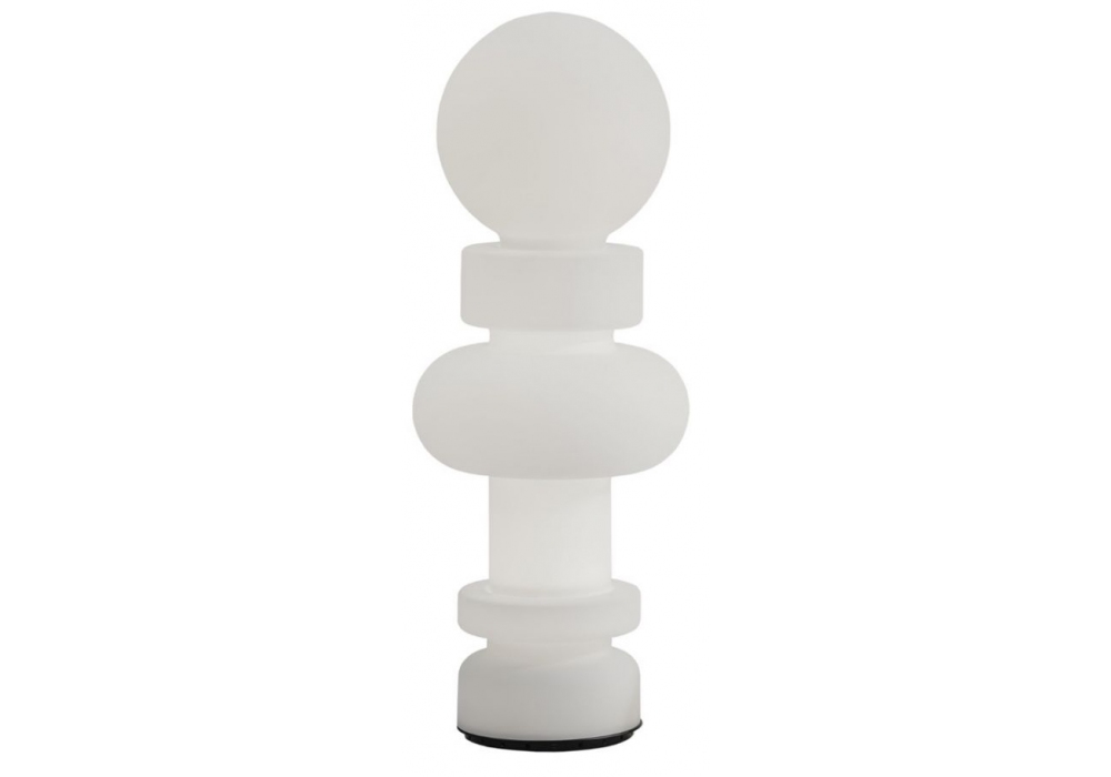 Re diseñada por Bobo Piccoli para Fontana Arte es una lámpara de sobremesa / pie, íntegramente en vidrio soplado satinado y base circular en metal pintado. La fuente de luz utilizada es de tipo LED regulable (incluida).