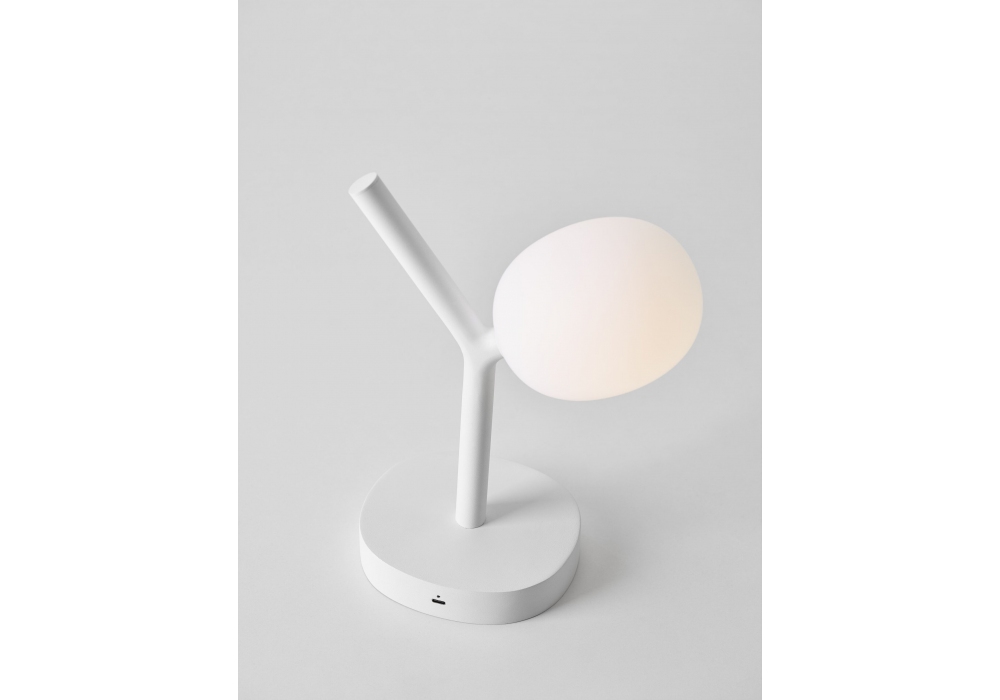 Ivy Battery diseñada por Lucie Koldova para Brokis es una lámpara de mesa portátil con base circular en metal pintado en polvo. El difusor tiene forma ovalada de vidrio soplado con una superficie exterior grabada al ácido (opaca). La fuente de luz es un LED regulable táctil con un cable de alimentación USB negro o plateado. Ivy Battery está disponible en diferentes acabados.