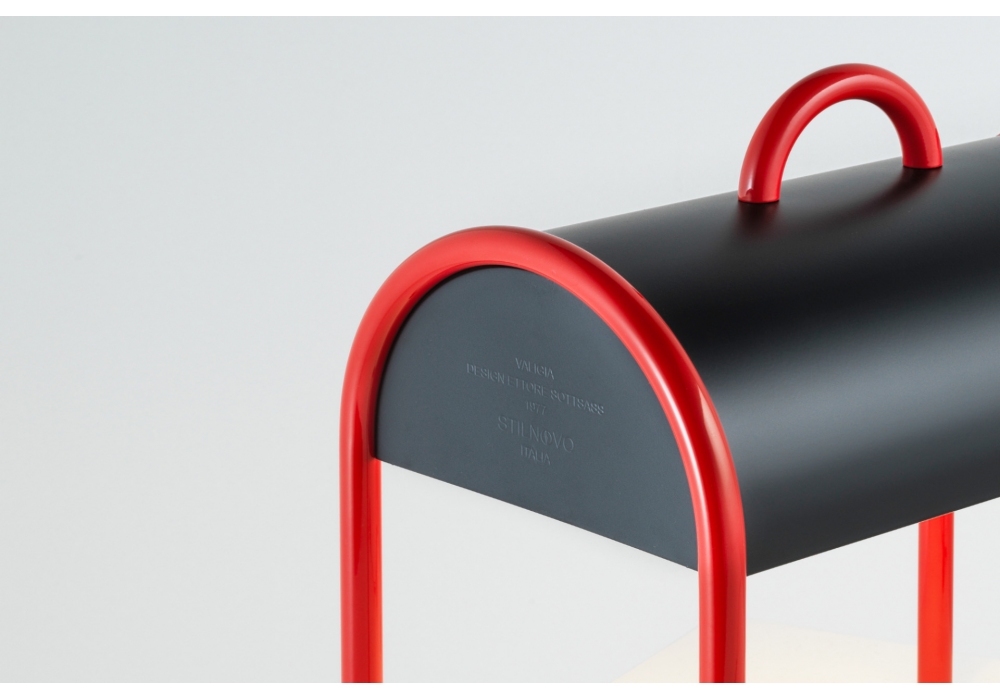 Valigia diseñada por Ettore Sottsass para Stilnovo es una lámpara de mesa con estructura cuadrangular en metal pintado en un solo acabado rojo y negro. El difusor tiene forma arqueada y adopta una fuente de luz LED alimentada por un cable de plástico con interruptor de encendido/apagado.