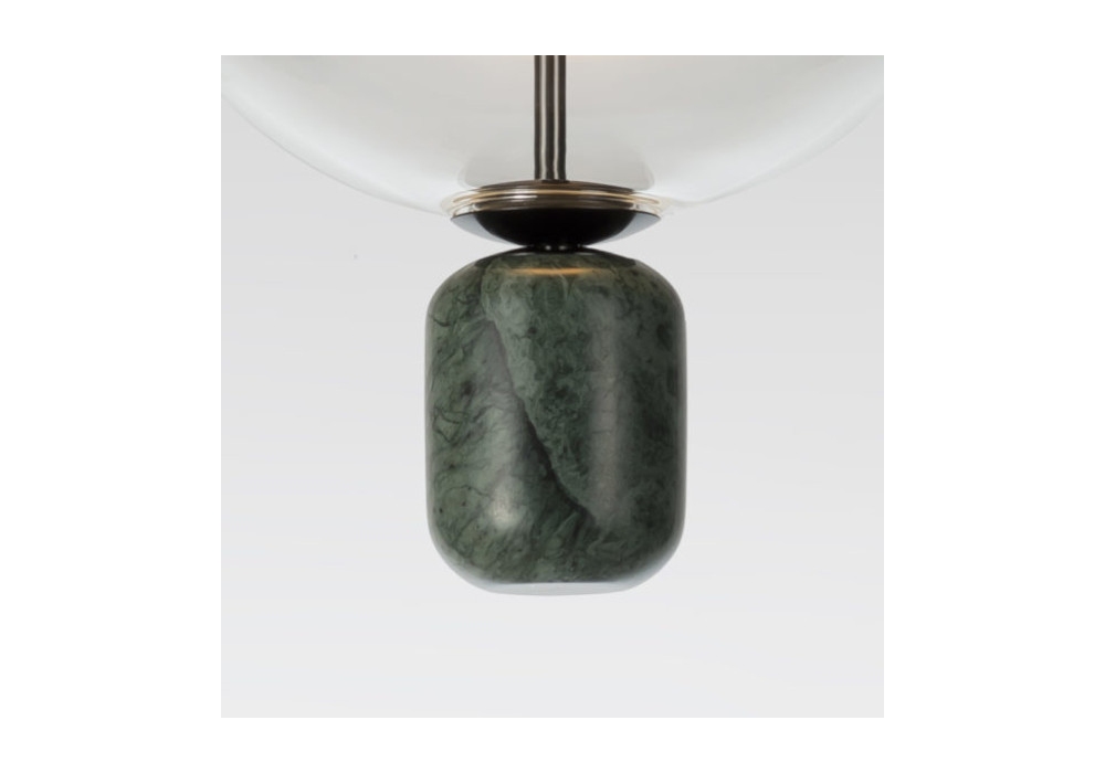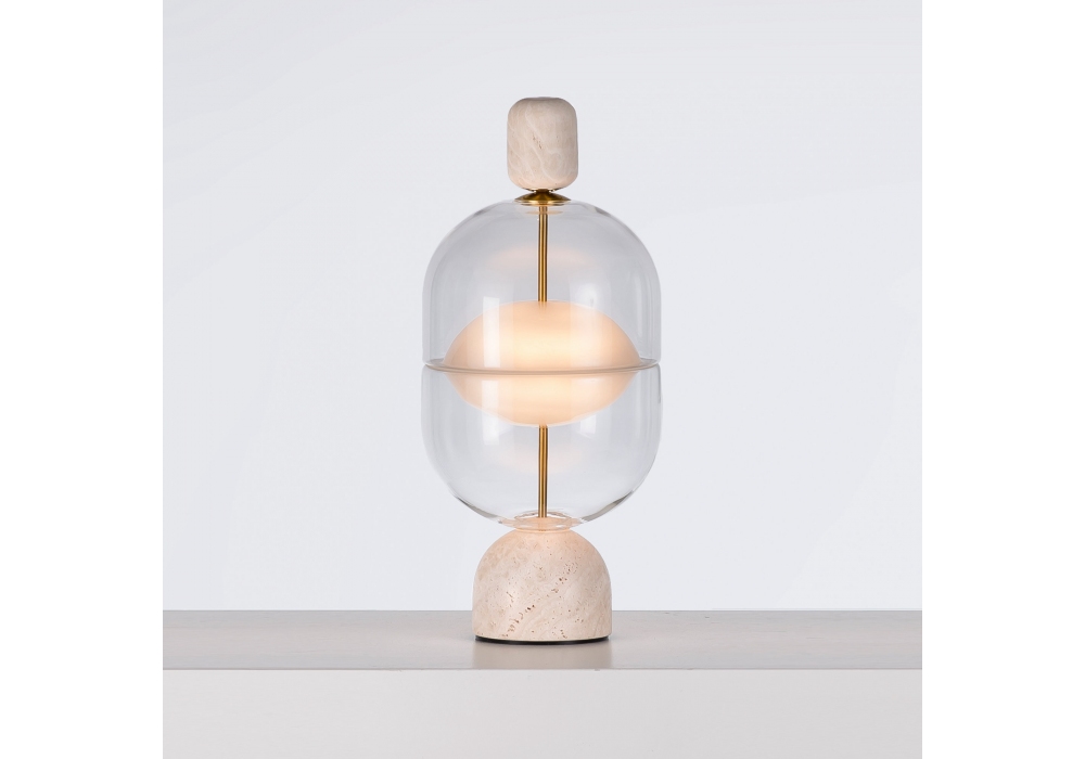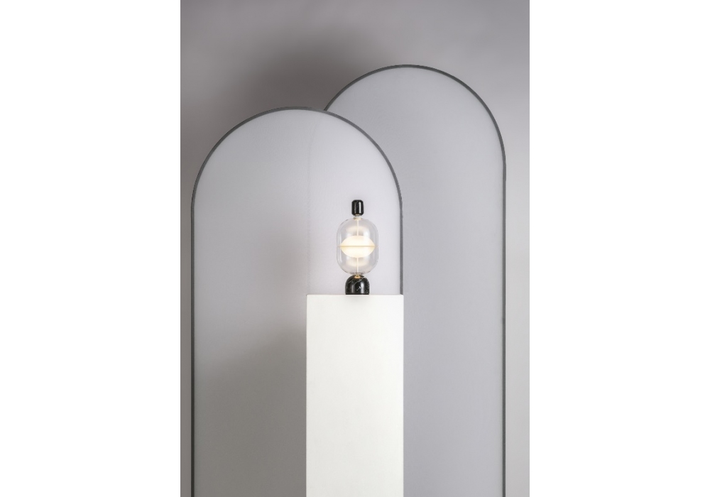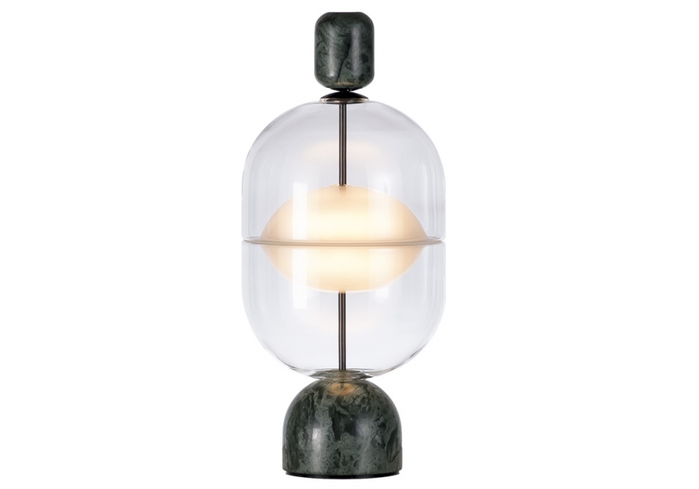 Indre diseñada por Nikolai Kotlarczyk para Rakumba es una lámpara de mesa caracterizada por una cápsula de vidrio. Piezas de metal y mármol disponibles en diferentes acabados.