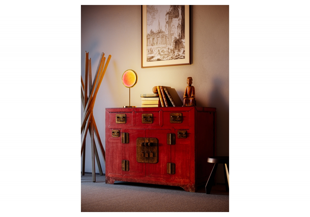 Talismano (Other Smiths) diseñada por Enzo Catellani para Catellani & Smith es una lámpara de mesa con estructura en latón sin tratar y difusor de vidrio tornasolado artesanalmente, con un color tornasolado.