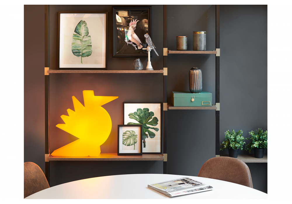 Here diseñada por Alessandro Mendini para Slide es una pequeña lámpara de mesa con un alto impacto visual, con una forma abstracta y geométrica. Disponible en la versión brillante y en la versión lacada en diferentes acabados