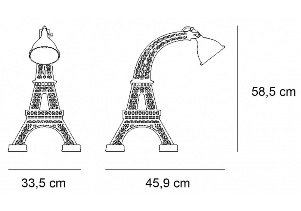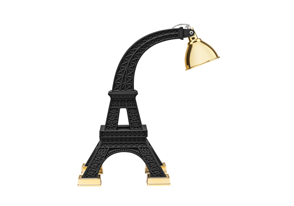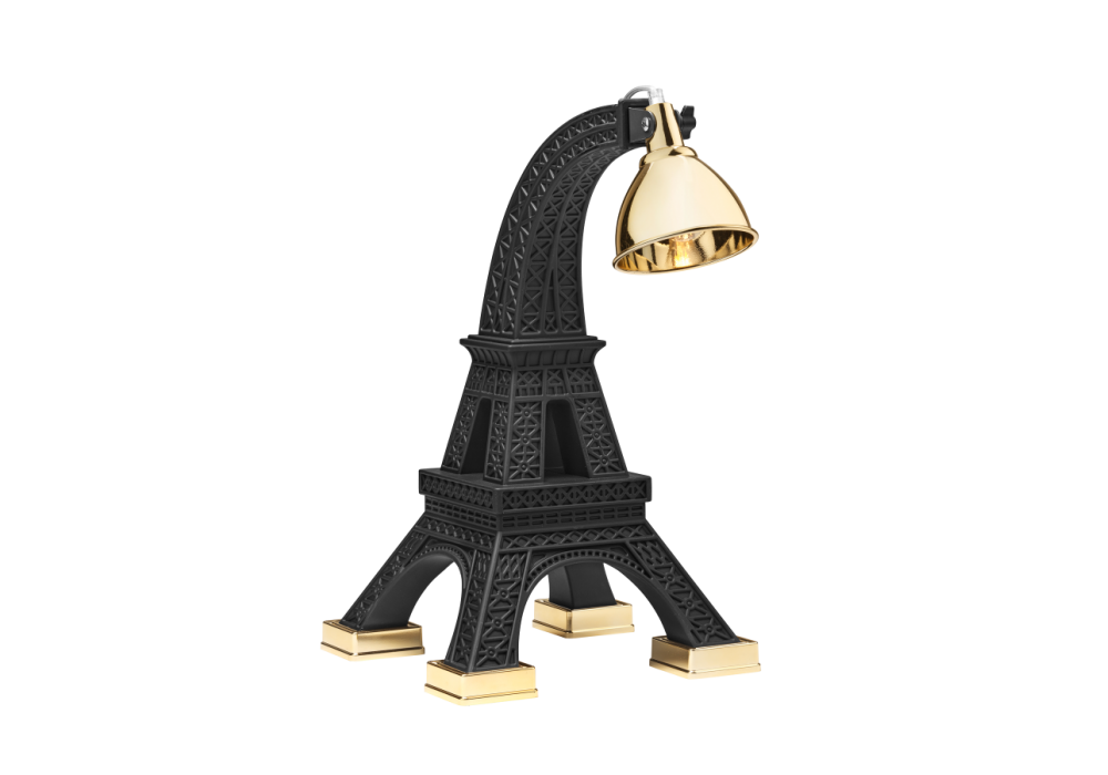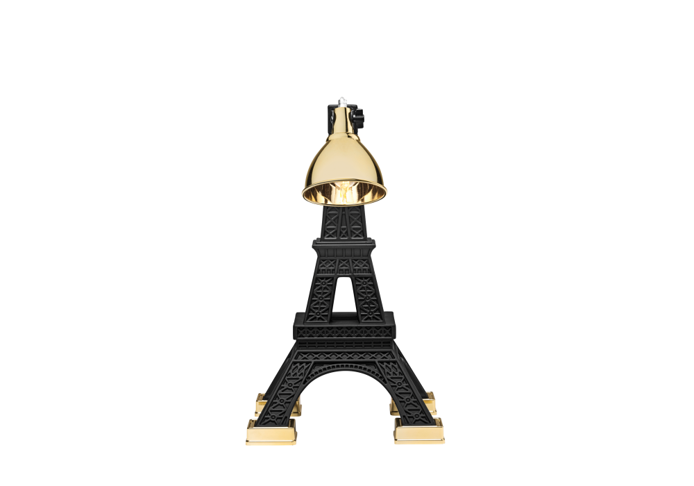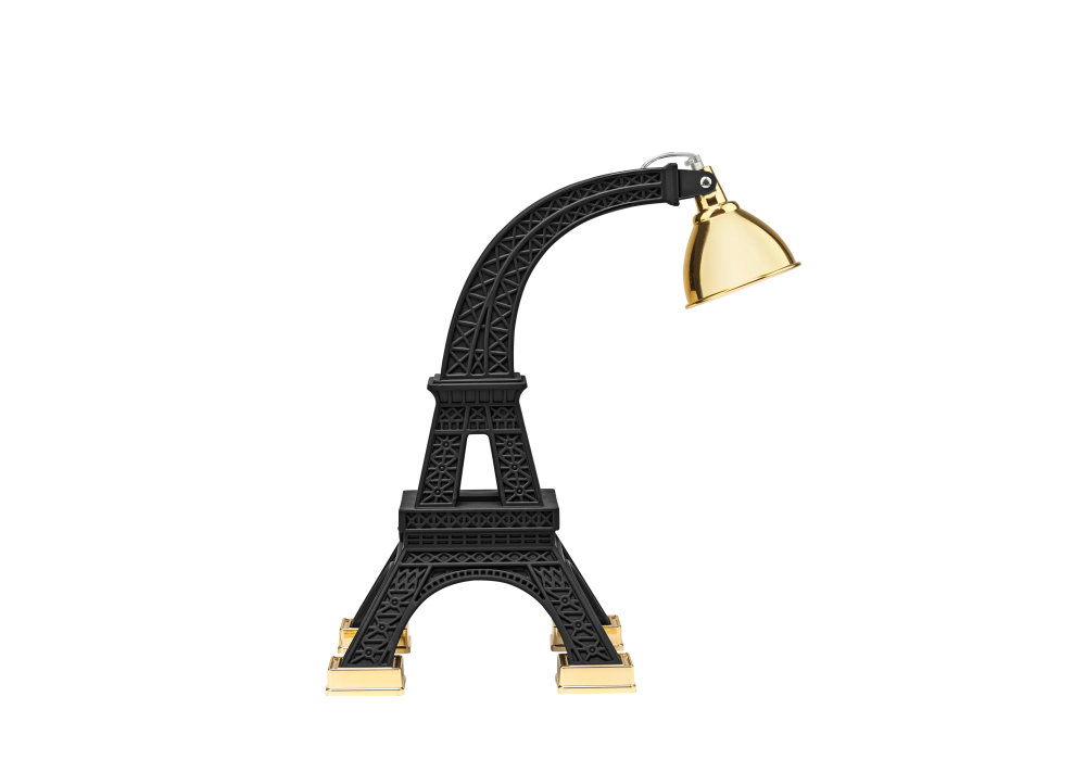 Paris M diseñada por Studio Job para Qeeboo es una lámpara de mesa en metal y polietileno pintado en blanco o negro con detalles en latón. El difusor tiene una forma de cúpula de latón ajustable.