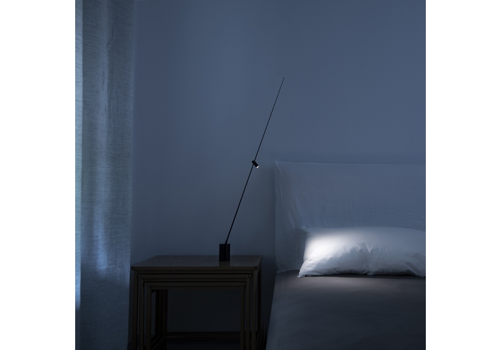 FM diseñada y producida por Davide Groppi es una lámpara de sobremesa estructurada por una base cilíndrica en ABS, una varilla móvil en fibra de carbono y un foco metálico orientable. La fuente de luz adoptada es de tipo LED, que se puede regular en diferentes tonalidades de luz.