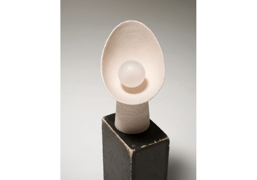 Sophia diseñada por Studiopepe para Tacchini es una lámpara de mesa con lámpara en vidrio opal blanco, difusor y estructura en cerámica, disponible en diferentes acabados.