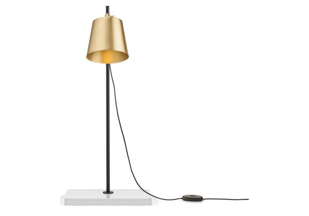 Lab Light diseñada por Anatomy Design para Karakter es una lámpara de mesa con difusor en latón cepillado, laca transparente, tija en acero pintado y base en porcelana blanca. Fuente de alimentación con enchufes intercambiables (EU/UK/AU) incluidos.