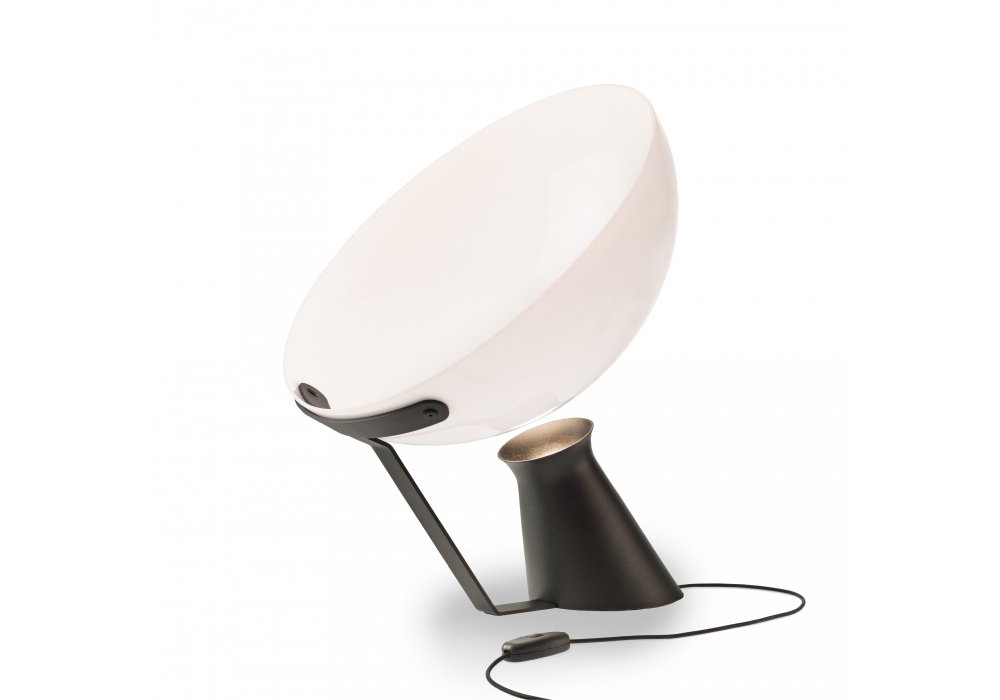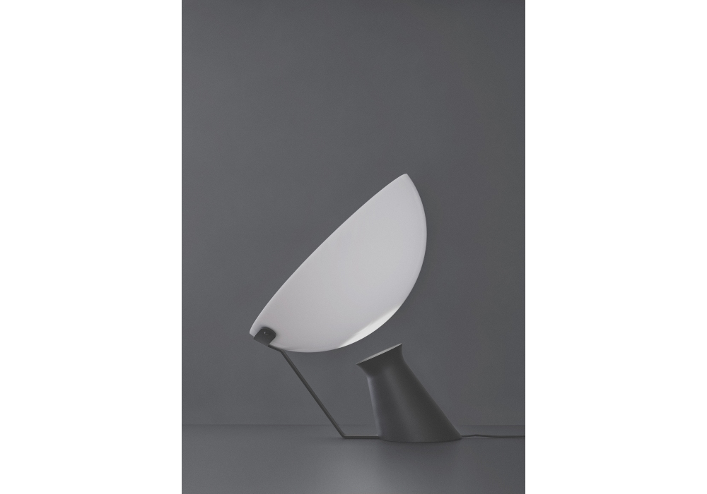 Aida diseñada por Angelo Mangiarotti para Karakter es una lámpara de mesa realizada en aluminio y acero pintado en polvo negro. La pantalla de acrílico opalescente.