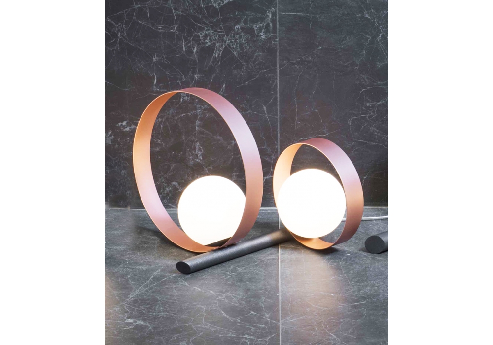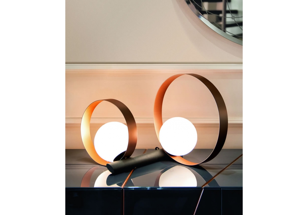 Bubble Duo DT diseñada por Riflessi es una lámpara de mesa formada por dos aros metálicos de diferentes tamaños, tubo de soporte pintado en grafito y cable eléctrico de tela negra. La fuente de luz proviene de las bombillas de cristal blanco satinado.