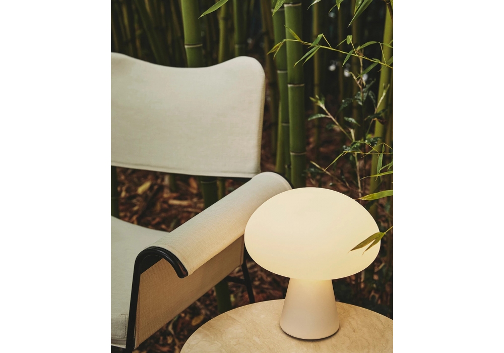 Obello diseñada por Bill Curry para Gubi es una lámpara recargable que se puede mover fácilmente entre el interior y el exterior. Con una carga completa en cuatro horas y media, proporcionando hasta 40 horas de luz. Está hecho de vidrio soplado a mano esmerilado.
