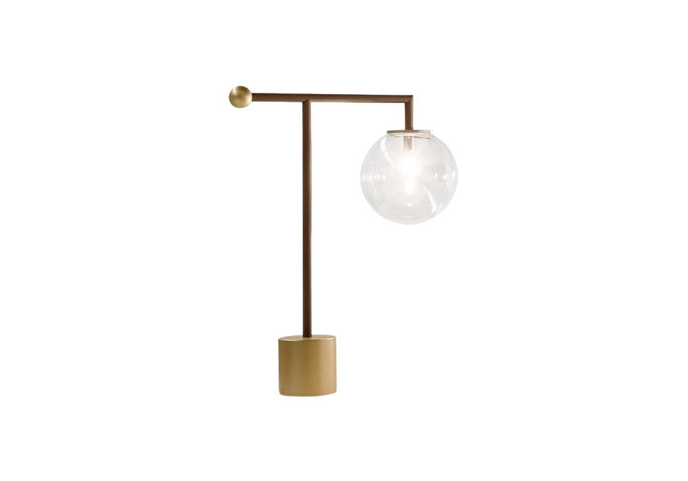 Bardot diseñada por Laura Cazzaniga e Ilaria Limonta para Bonaldo es una lámpara de mesa con pantalla en cristal transparente, estructura en metal pintado en diferentes acabados, base y esfera en metal color latón mate.