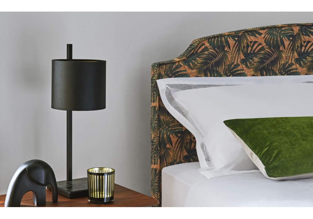 Hortense diseñada por Treca Interiors Paris es una lámpara de mesa lacada en negro satinado con cubre lámpara cilíndrico en tejido negro/alizor.