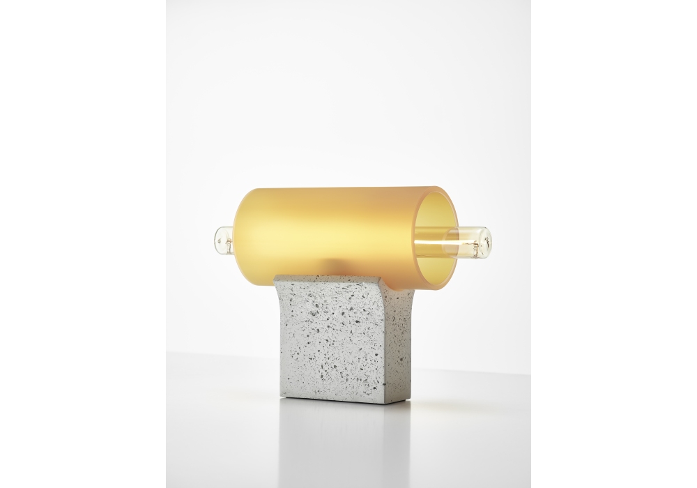 Overlay diseñada por Lucie Koldova para Brokis es una lámpara de mesa con base cuadrangular en hormigón de alto rendimiento. El difusor es tubular de vidrio soplado con superficie brillante o grabada al ácido y apantalla una fuente de luz LED regulable alimentada por un cable revestido de fibra textil. Overlay está disponible en diferentes acabados.