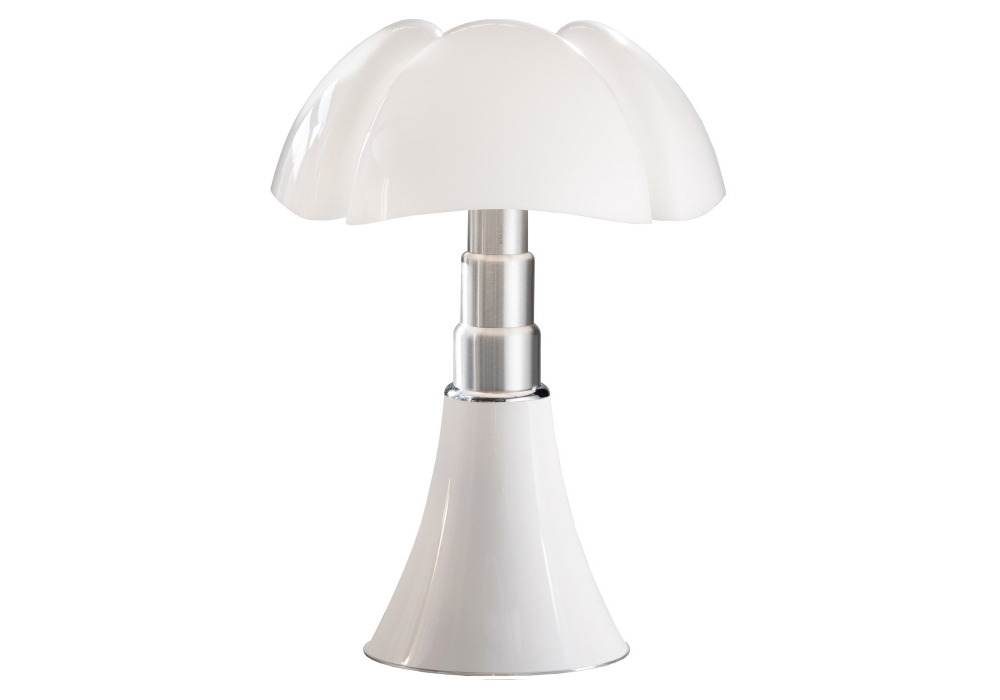 Pipistrello 4.0 diseñada por Gae Aulenti para Martinelli Luce es una lámpara de mesa o de pie con brazo central telescópico en acero inoxidable y base en metal pintado. El difusor es de metacrilato opal blanco y apantalla una fuente de luz LED integrada regulable vía bluetooth. Pipistrello 4.0 está disponible en diferentes acabados.