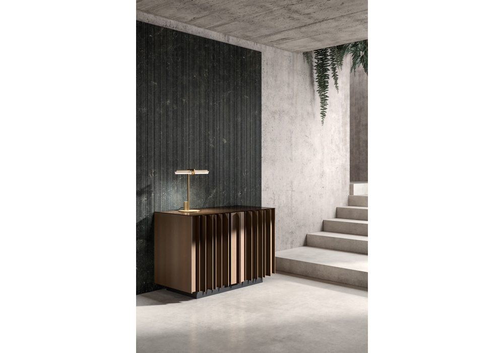 Optical diseñada por Massimo Tonetto para Venicem es una lámpara de mesa con luz difusa. Estructura en latón bruñido natural y cristal, cristal ahumado o ámbar. Triángulo Triangular.