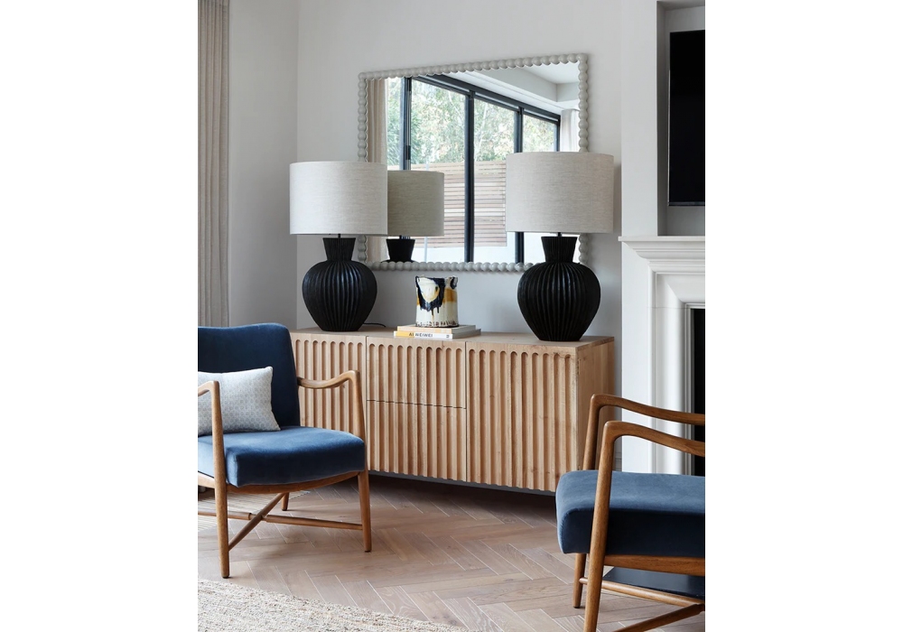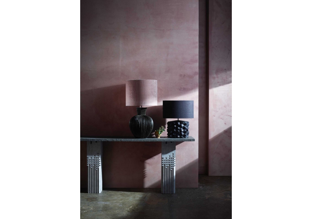 Costance diseñada y producida por Porta Romana es una lámpara de mesa inspirada en el arte japonés del origami con cuerpo de lámpara de Jesmonite y metal. La pantalla es de tela y apantalla una fuente de luz tipo LED con casquillo E27. Costance está disponible con pantalla ondulada o lisa y en diferentes acabados de tejido y estructura.