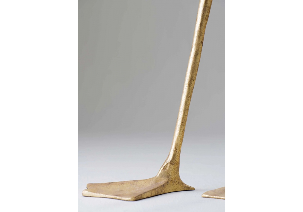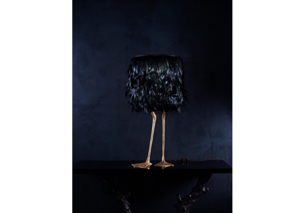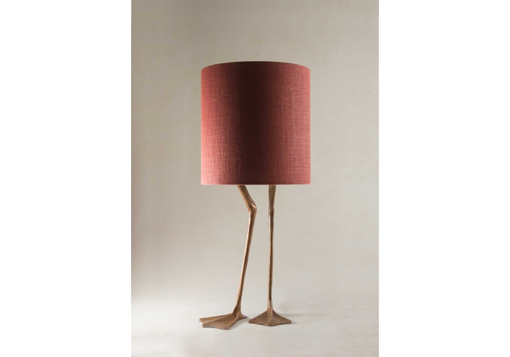 Duck Feet diseñada y producida por Porta Romana es una lámpara de mesa inspirada en los proyectos de Meret Oppenheim. La base está estructurada en latón obtenido por fusión y pintado en diferentes acabados. La pantalla es de tela y apantalla una fuente de luz de tipo LED con casquillo E27 alimentado por cable de fibra textil. Duck Feet está disponible con pantalla de tela o pluma en diferentes acabados.