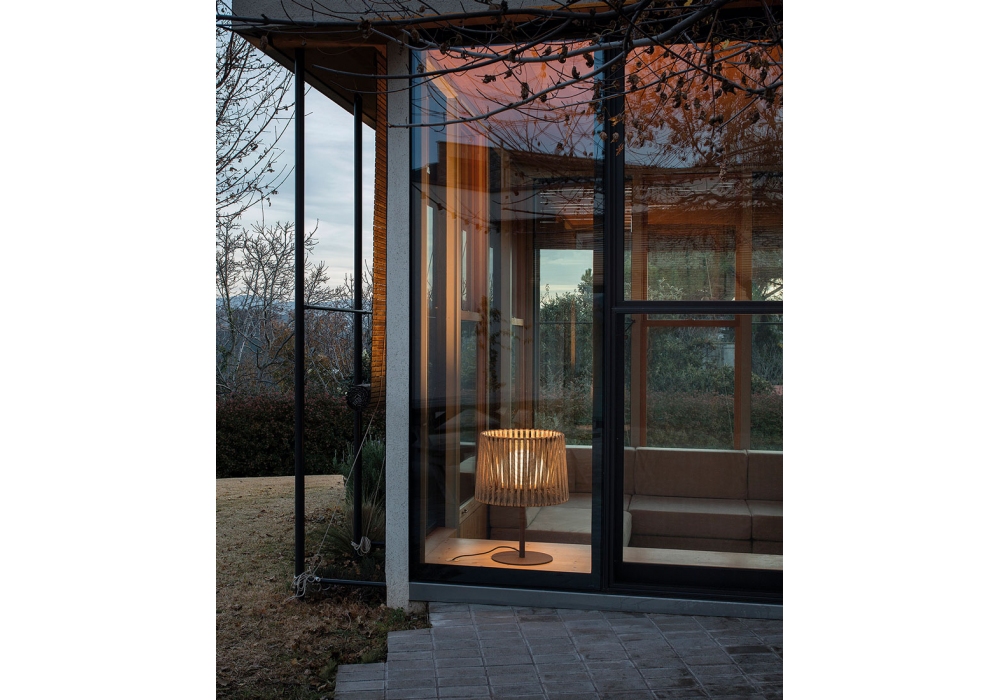 Oh Lamp diseñada por Studio expormim para Expormim es una lámpara de mesa para exterior con estructura acabada con pintura poliéster en polvo y cuerda tejida de alta resistencia. Fuente de luz LED. Disponible en diferentes acabados.