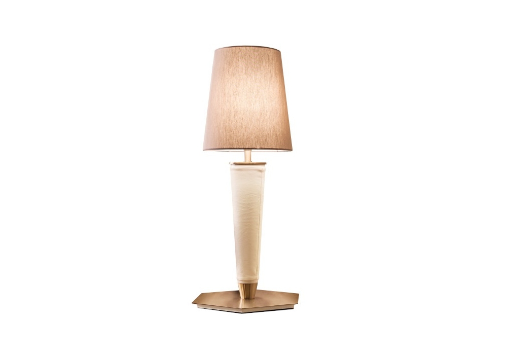 Noir diseñada por Andrea Bonini para Turri es una lámpara de mesa con estructura en metal acabado oro o bronce. La estructura está revestida en diferentes pieles con pantalla de tela a juego.