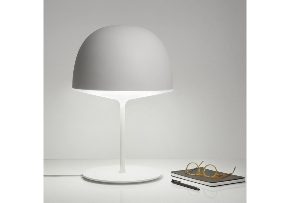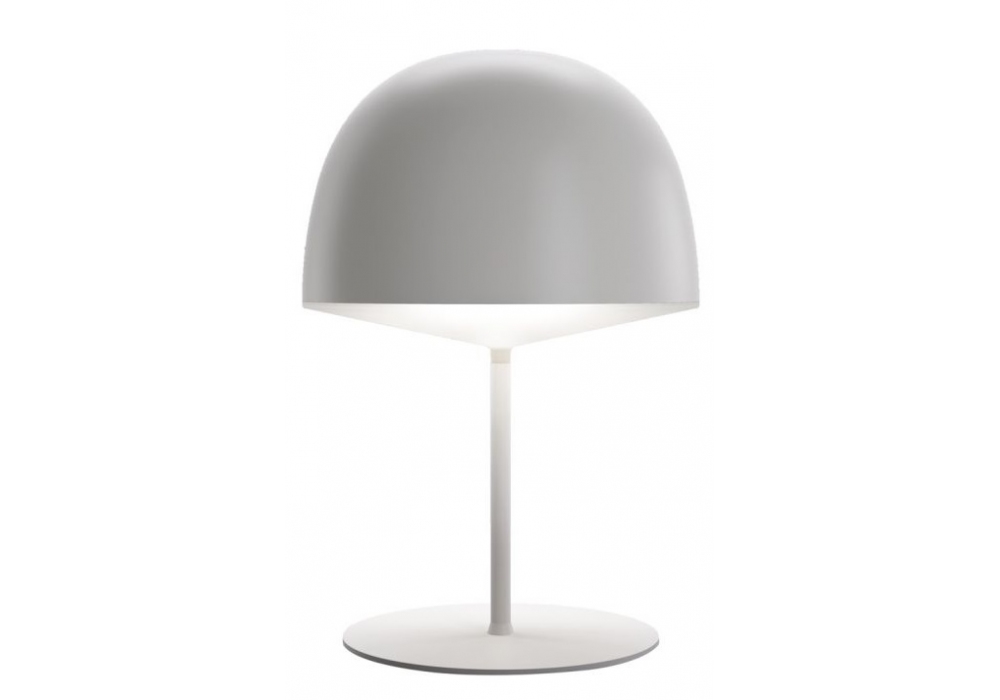 Cheshire diseñada por GamFratesi para Fontana Arte es una lámpara de mesa de luz directa no regulable con estructura de metal pintado. Difusor superior en policarbonato pintado y difusor inferior en policarbonato opal. Cable transparente, interruptor y enchufe. Disponible en diferentes acabados.