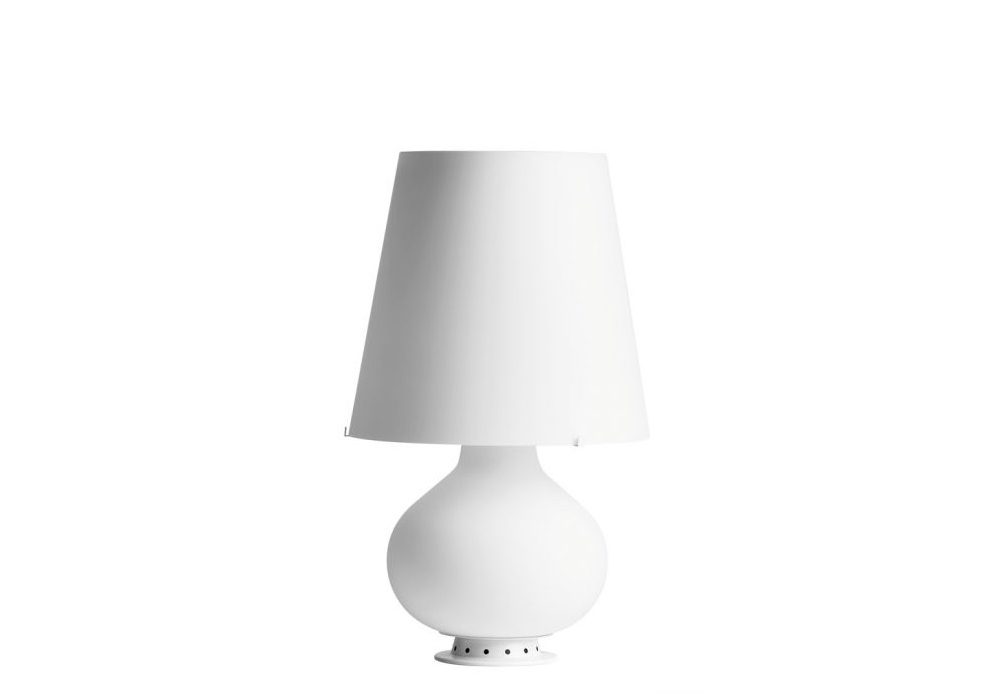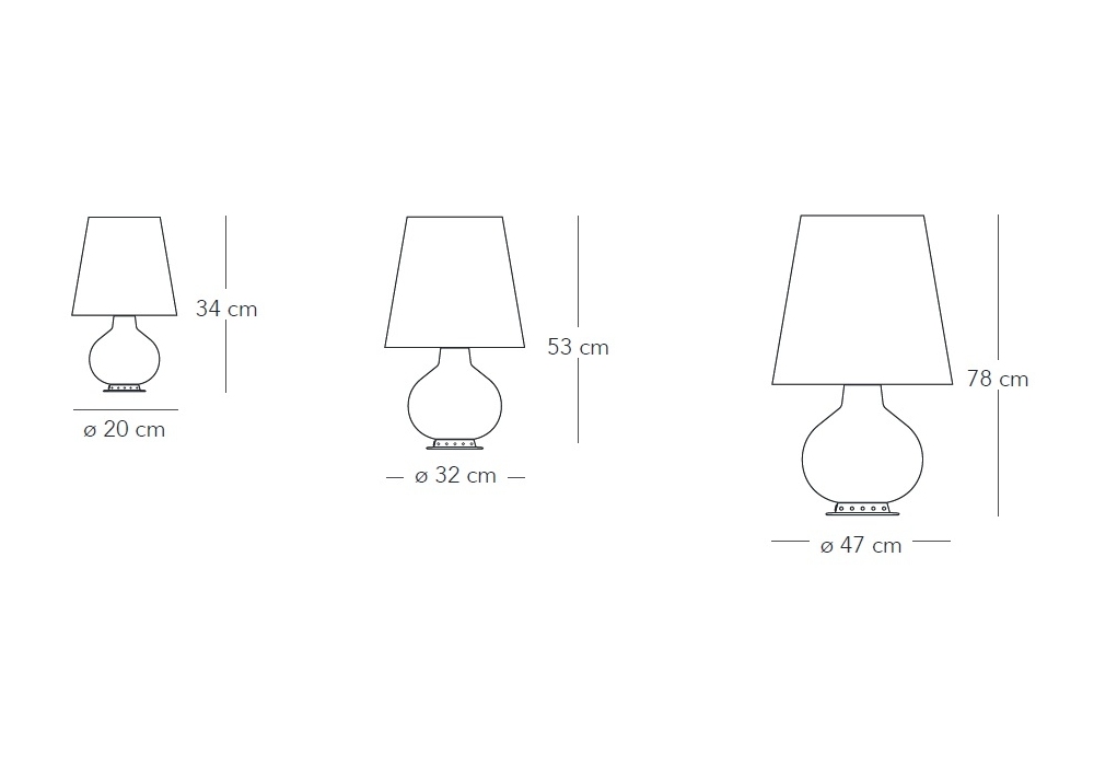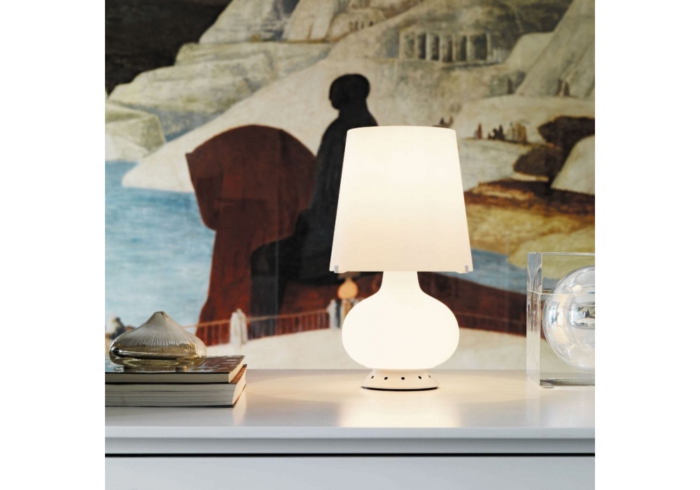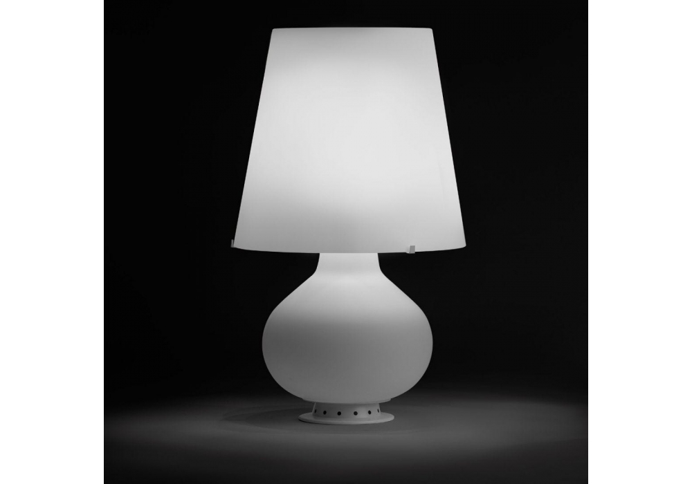Fontana diseñada por Max Ingrand para Fontana Arte es una lámpara de mesa no regulable de luz difusa con estructura en metal pintado, difusor y base en vidrio soplado blanco satinado. Cable de alimentación negro, interruptor y enchufe. La versión Ø 20 está equipada con un interruptor doble que permite iluminar el difusor y la base por separado, mientras que la versión Ø 47 con interruptor triple permite iluminar la base, la parte superior e inferior del difusor por separado. Disponible en diferentes dimensiones.