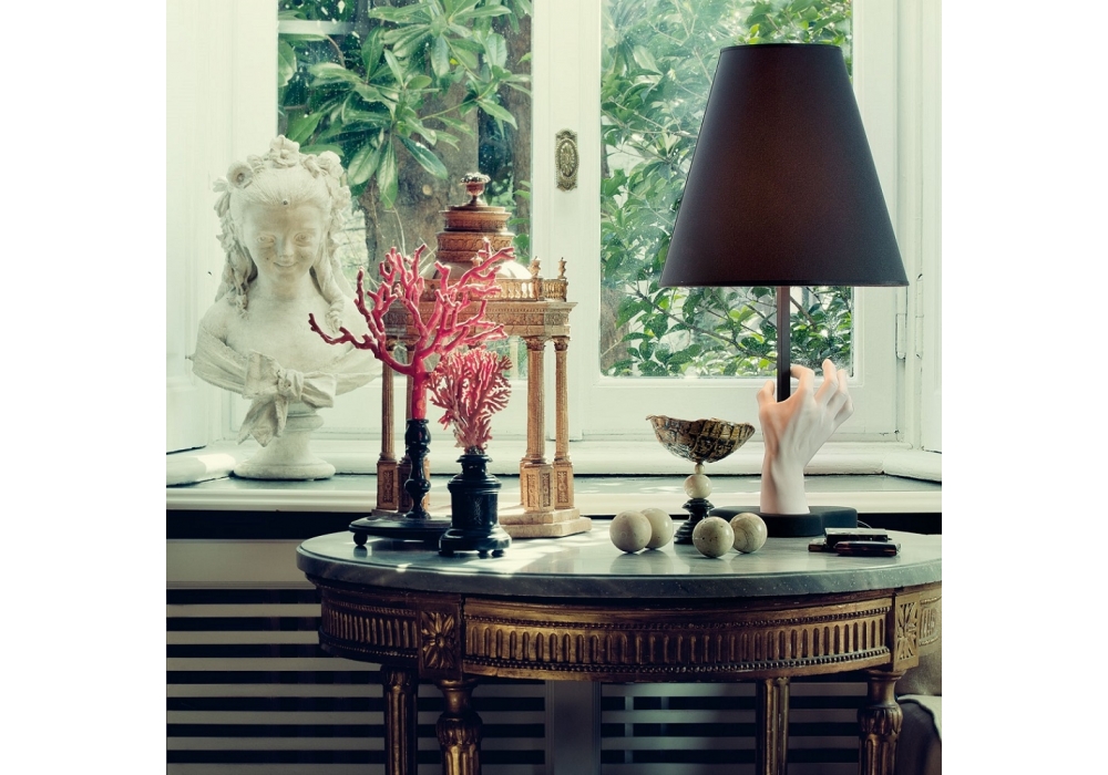 Mano diseñada por Pietro Chiesa para Fontana Arte es una lámpara de mesa de luz difusa regulable con base en polvo de mármol y resina y tija en metal de sección cuadrada barnizado soft touch. Mano en polvo de mármol y resina. Difusor en tejido negro acoplado interiormente con PVC blanco. Cable negro, dimmer y enchufe.