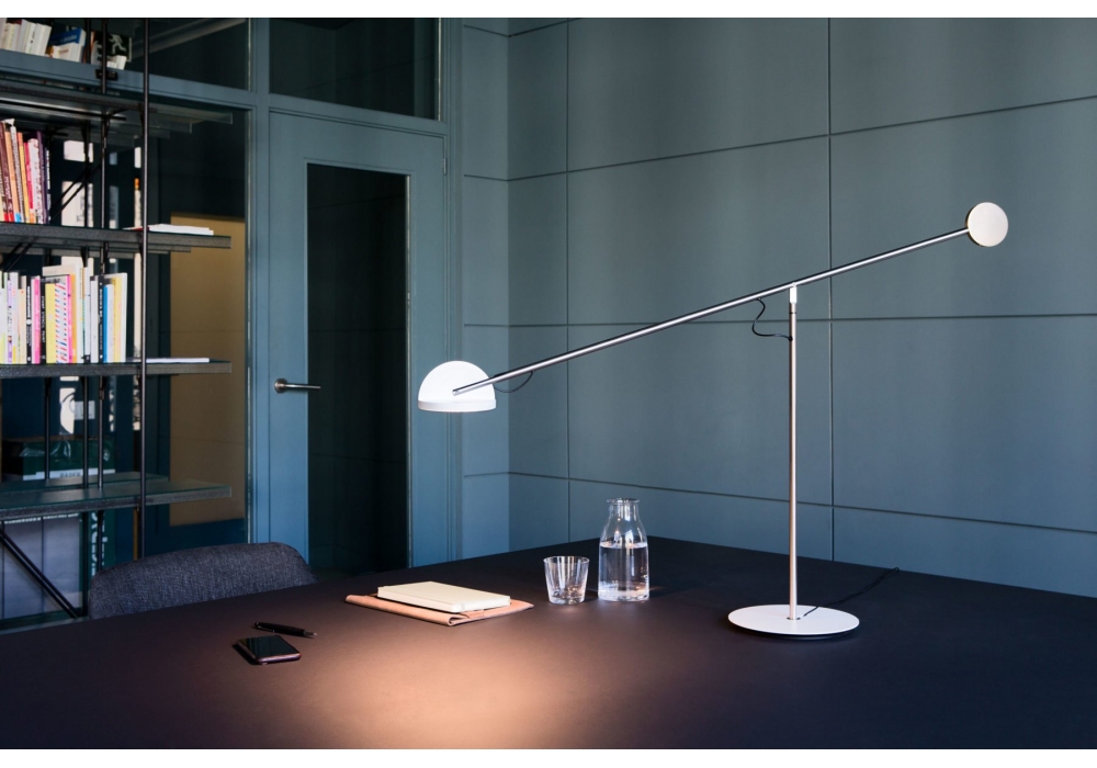 Copérnica M diseñada por Ramírez i Carrillo para Marset es una lámpara de mesa con estructura en níquel satinado o grafito, base en acero y difusor en aluminio. Disponible en diferentes acabados.
