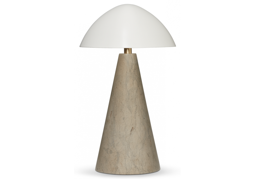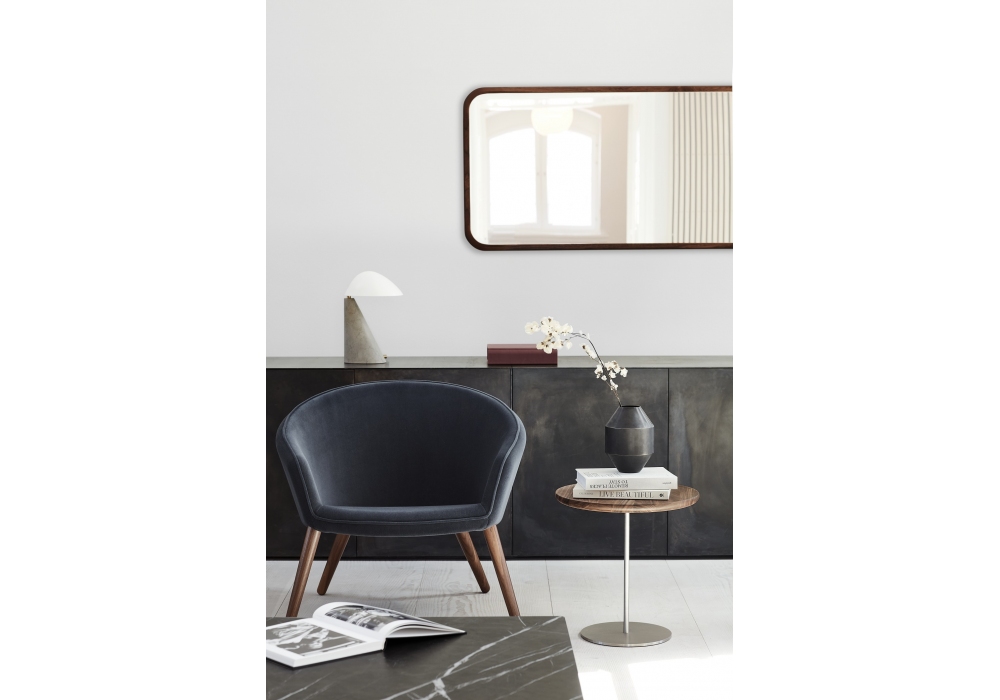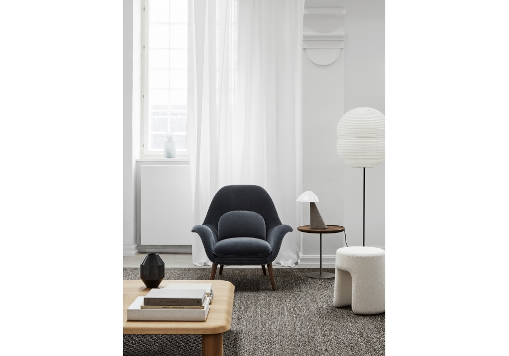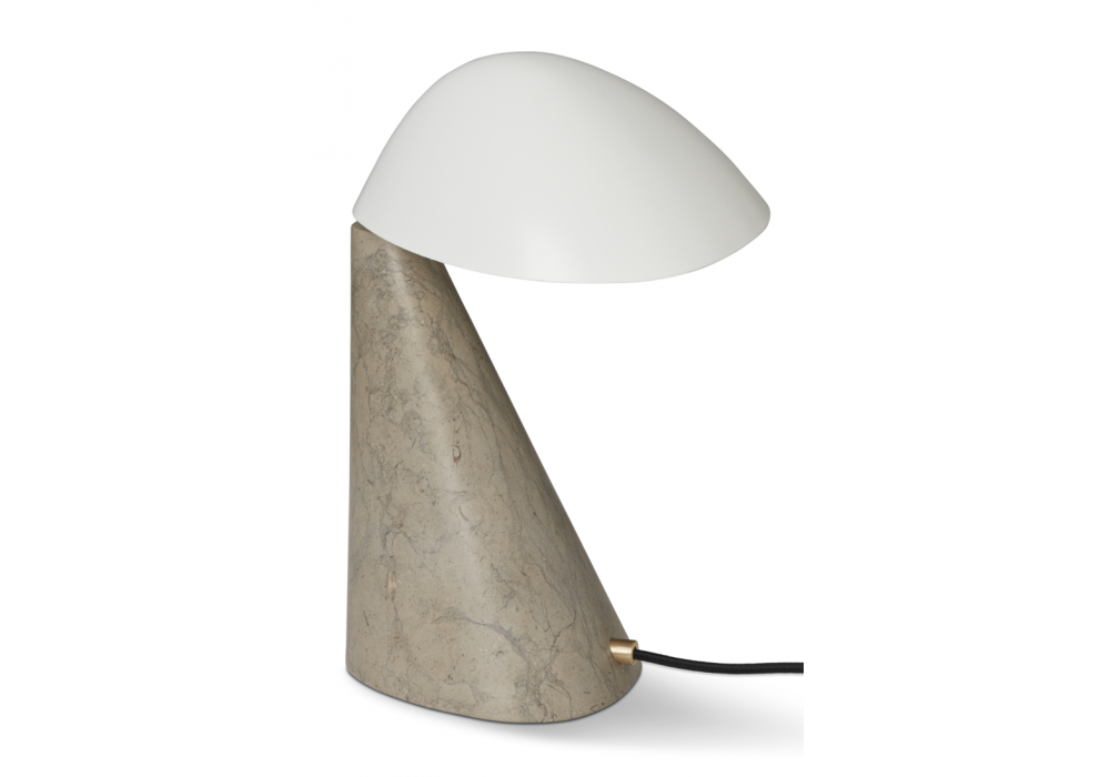Fellow diseñada por Space Copenhagen para Fredericia es una lámpara de mesa LED realizada con una base de piedra caliza atlántica oscura y una pantalla de acero con recubrimiento en polvo que puede girar un máximo de 150 grados a cada lado desde la posición central. Cable de alimentación de tela negra con interruptor de encendido/apagado. Detalles de latón macizo.