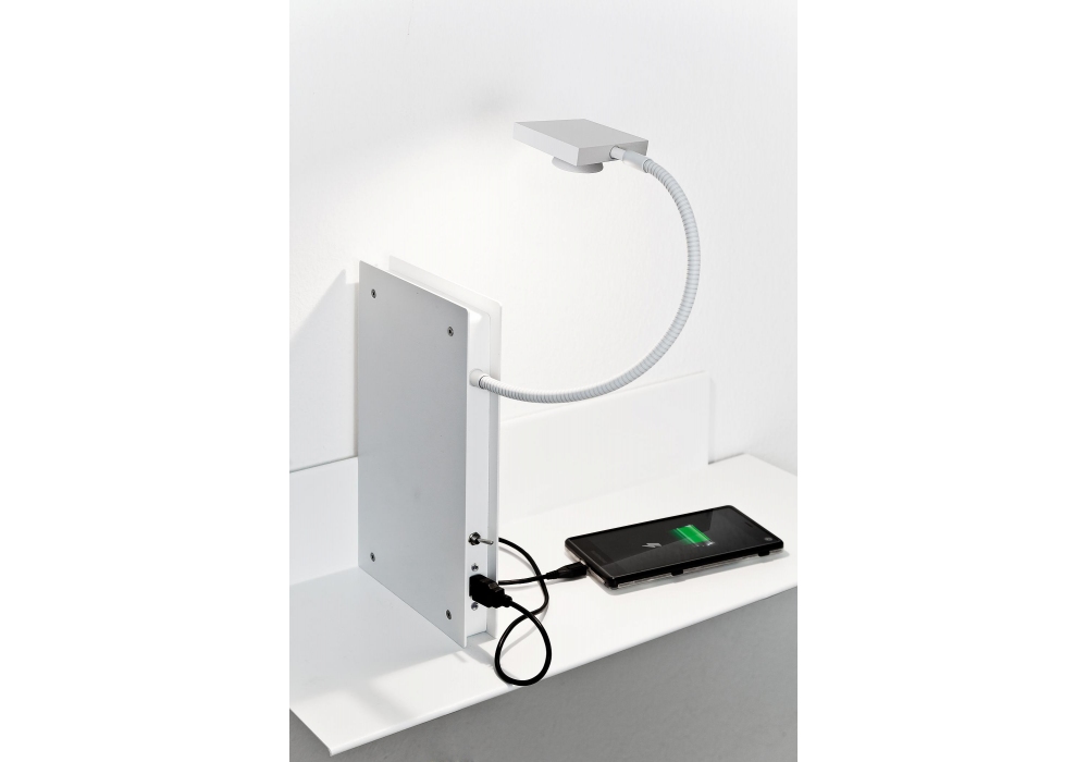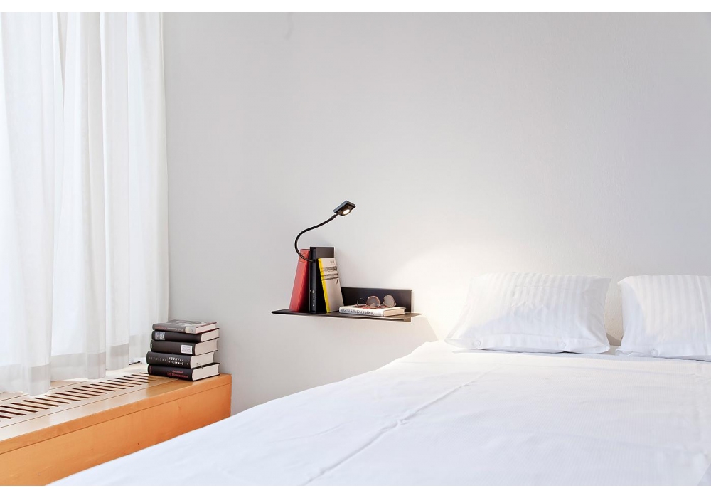 Oskar on the Shelf diseñada y producida por Ingo Maurer es una lámpara de mesa que se puede fijar a la pared. Está equipado con un cuello de cisne ajustable y flexible, que permite colocar el módulo de luz en múltiples direcciones. La estructura es de metal pintado en polvo, en 2 acabados.