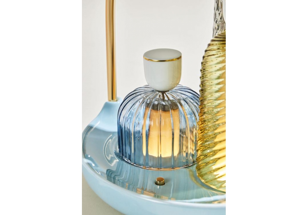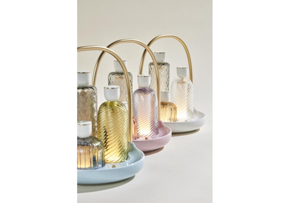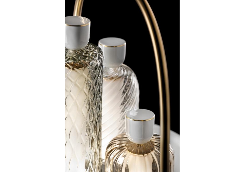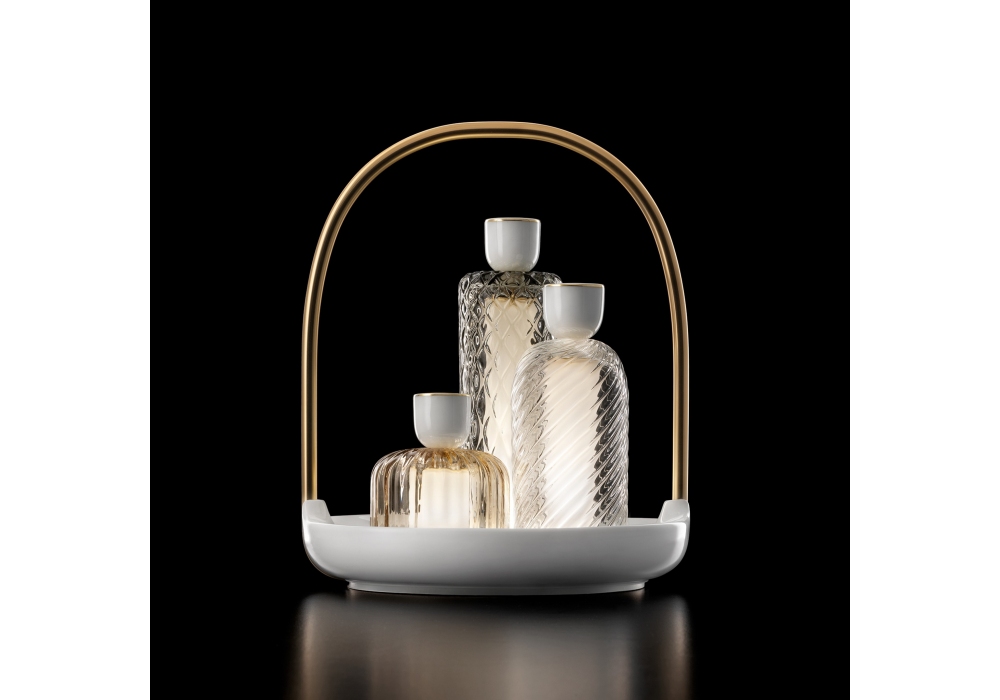 Trinitas diseñada por Luca Nichetto para Barovier & Toso es una lámpara de mesa recargable con base circular en porcelana y arco en tubo de metal galvanizado color oro. Los difusores son tres elementos en cristal veneciano con elaboración ballotòn, rigadìn y rigamenà y escudo de fuentes luminosas LED regulables. Trinitas está disponible en diferentes acabados.