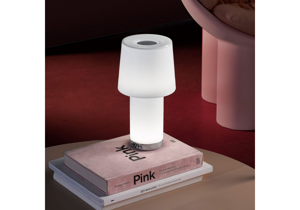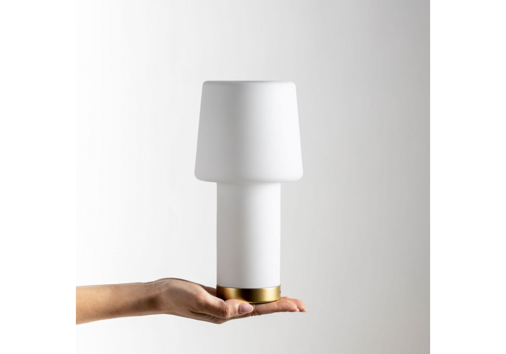 Cameo diseñada por Claesson Koivisto Rune para Fontana Arte es una lámpara de mesa recargable realizada en vidrio soplado satinado combinado con una estructura de metal pintado en oro satinado o metal cromado. El círculo metálico decorativo, colocado sobre el difusor, es del mismo material y acabado que la base y presenta el logo FontanaArte serigrafiado. El encendido, apagado y ajuste de la intensidad de la luz se realiza mediante un botón táctil transparente. Cable con enchufe USB incluido en el paquete.