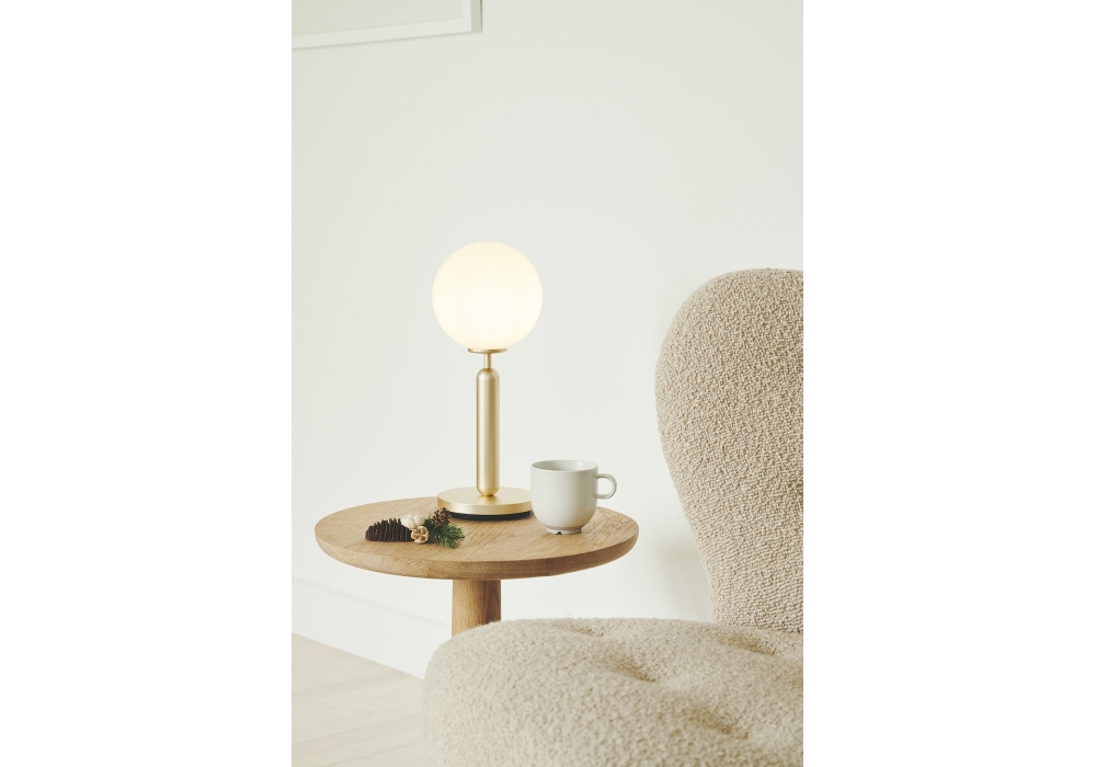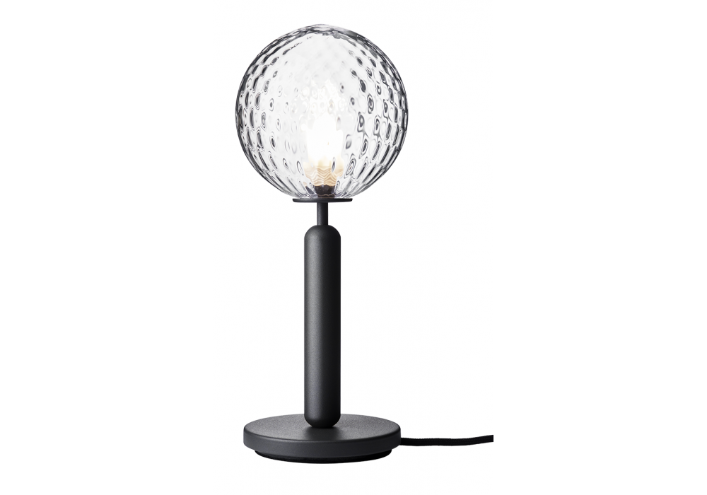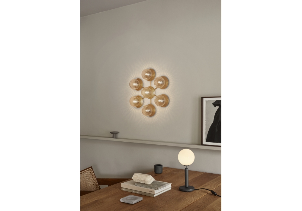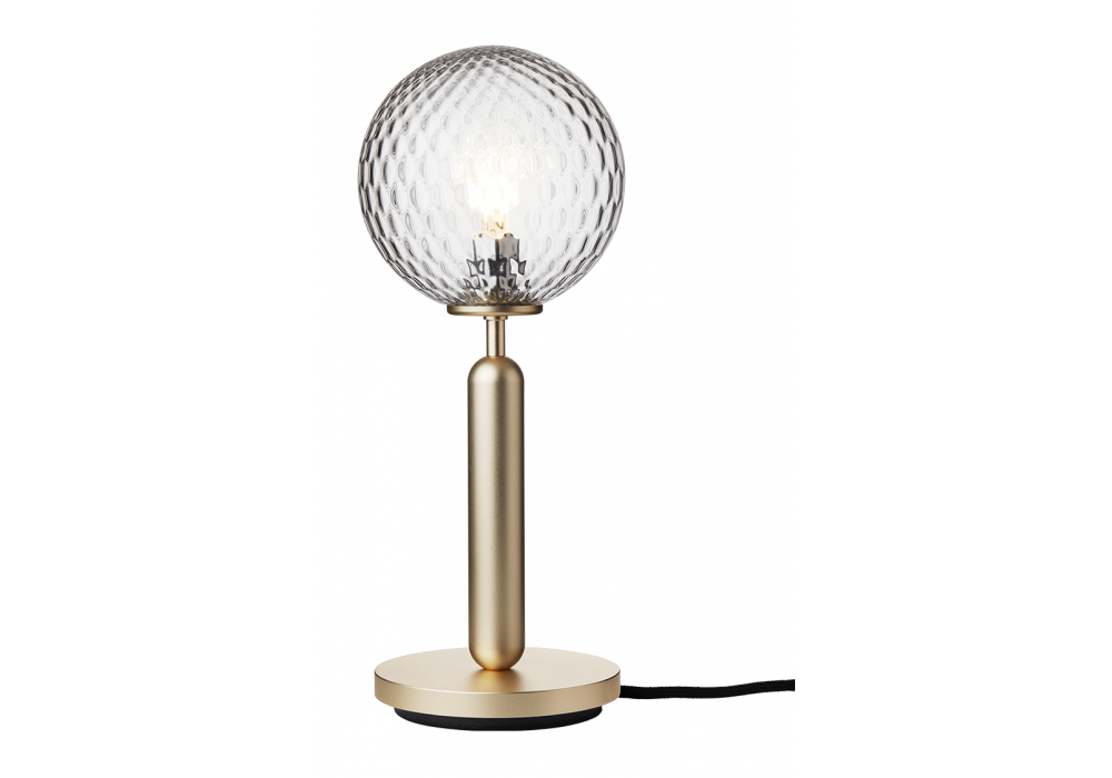 Miira diseñada por Sofie Refer para Nuura es una lámpara de mesa con estructura en metal trabajado y difusor en vidrio opalino soplado o transparente con dibujo en relieve.