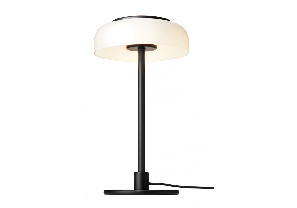 Blossi diseñada por Sofie Refer para Nuura es una lámpara de mesa con pantalla de vidrio opalino y base de metal negro o con pantalla transparente y base de metal nórdico dorado. Cable con regulador y enchufe.