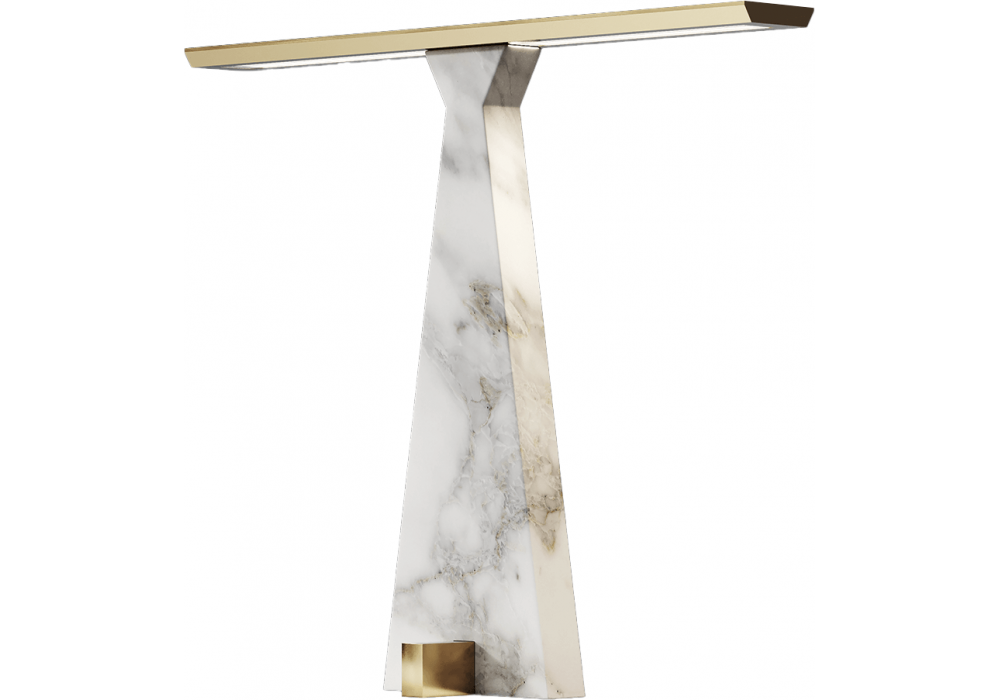Traccia diseñada por Stefano Traverso para Italamp es una lámpara de mesa con estructura en mármol Calacatta dorado, soporte, base y difusor en metal acabado oro claro cepillado.