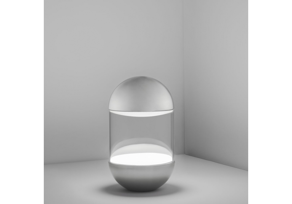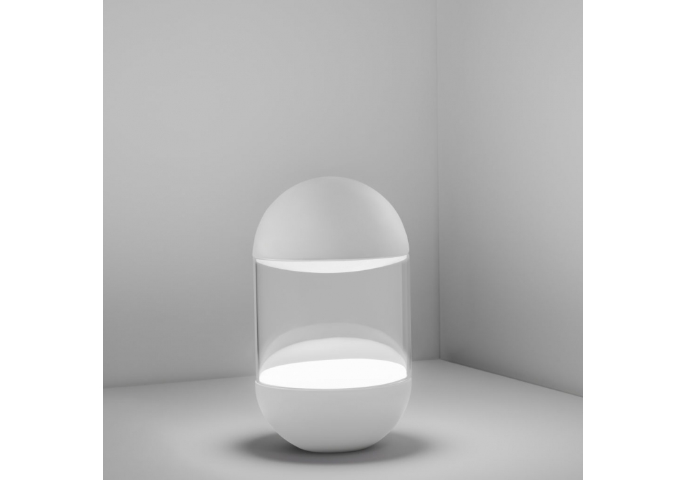 Pillola diseñada por Parisotto + Formenton para Firmamento Milano es una lámpara de mesa con luz indirecta realizada con una base en aluminio moldeado y un difusor en policarbonato satinado y vidrio borosilicato. Disponible en diferentes acabados.