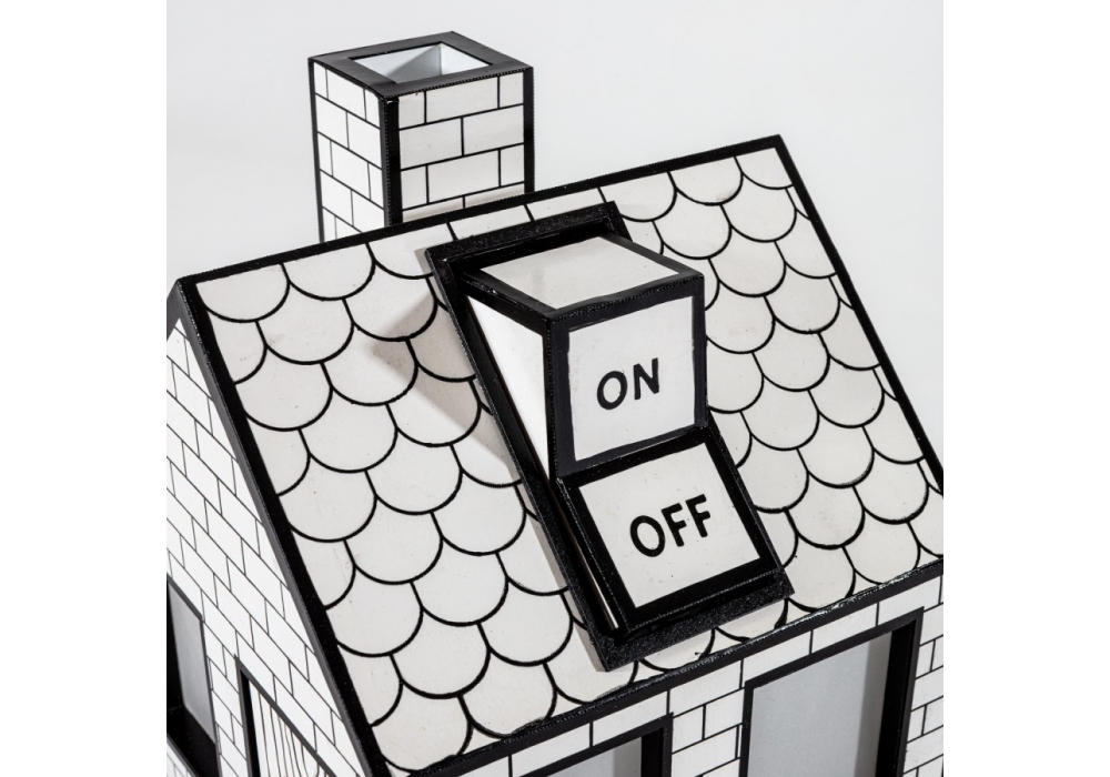 On-Off diseñada por Tomas Schats para Seletti es una lámpara de mesa que representa una pequeña casa de ladrillo realizada íntegramente con papel reciclado en blanco y negro. La fuente de luz adoptada es de tipo LED alimentada por un cable de plástico blanco.