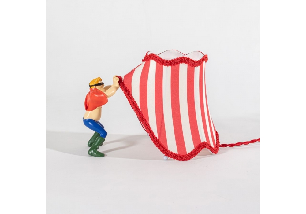 Circus Super Jimmy diseñada por Uto Balmoral para Seletti es una lámpara de mesa realizada en resina coloreada, metal y poliéster. La fuente de luz adoptada es de tipo LED alimentada por un cable rojo.