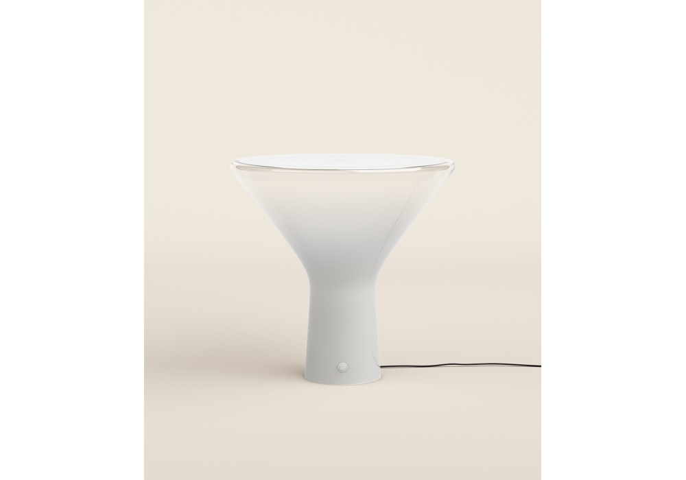 Accelsa diseñada por Angelo Mangiarotti para Karakter es una lámpara de mesa realizada en vidrio soplado y cable textil.
