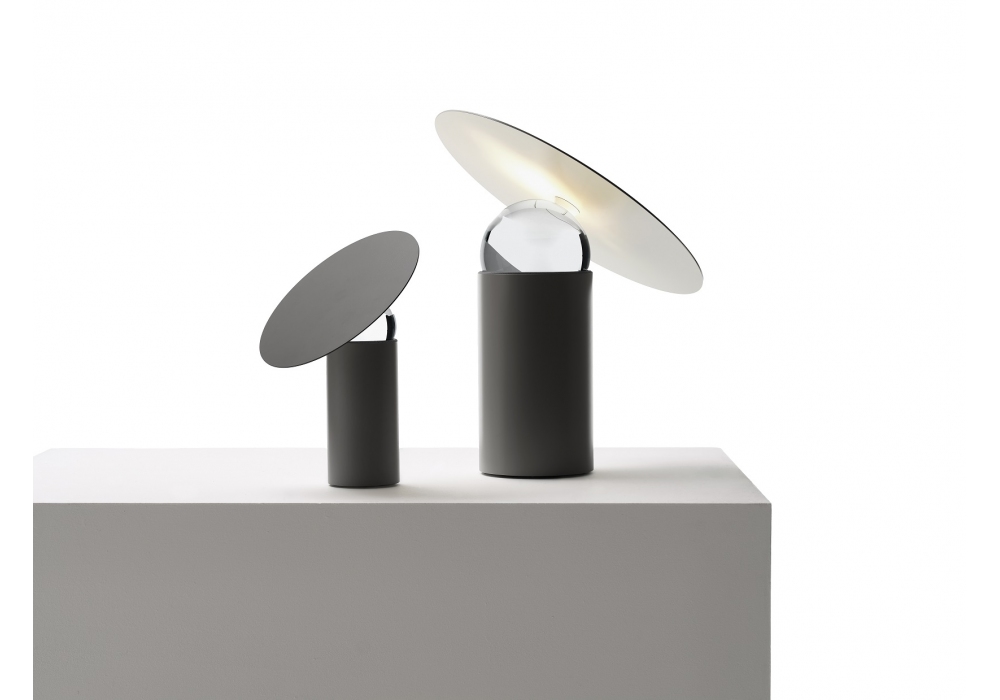 Era diseñada por Budde para Mogg es una lámpara de mesa regulable en metal con esfera de cristal y pantalla orientable. Disponible blanco RAL1013, negro RAL9017 u oro satinado.